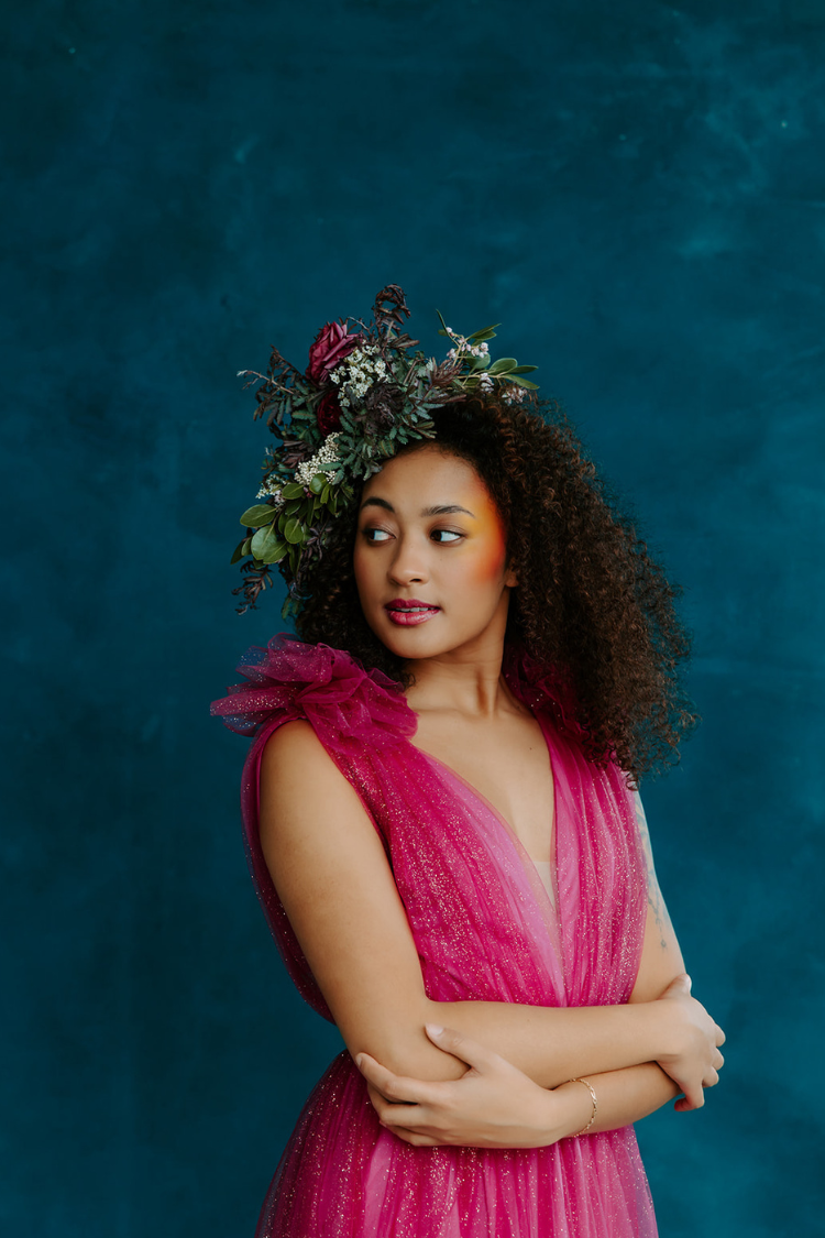 Jewel tones photograph exceptionally well under studio lighting. Rich colors like sapphire blue, emerald green, or deep purple or magenta create stunning depth and richness in professional lighting setups. Look at how epic the Alessia dress appears under the studio lights. These colors also complement a wide range of skin tones beautifully.