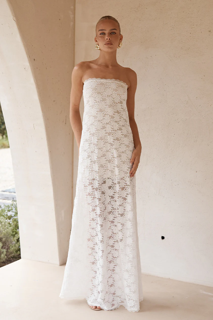 The Kinera Dress is a favorite spring bridal shower dress for our brides-to-be with its illusion-length maxi dress in on-trend white lace.
