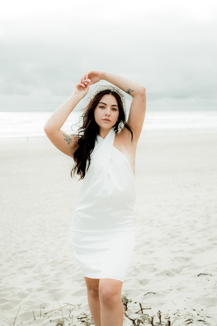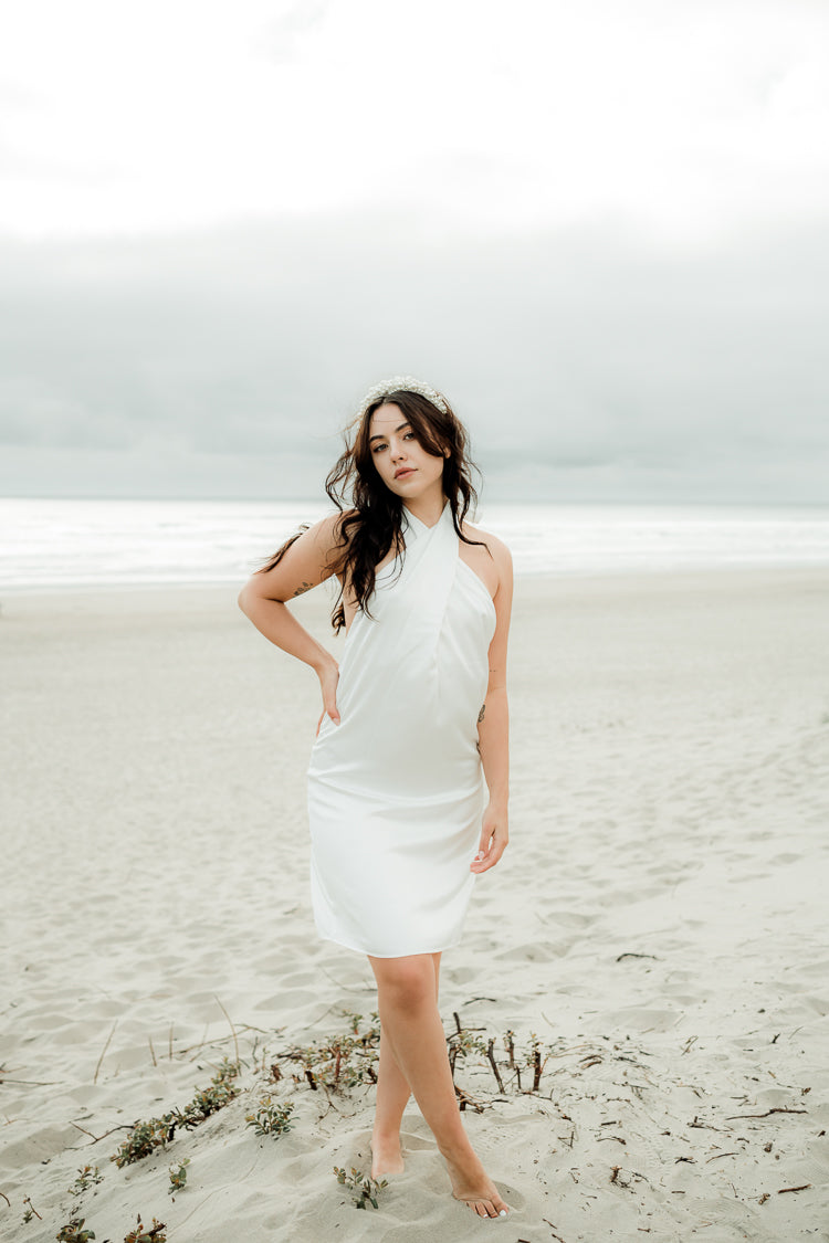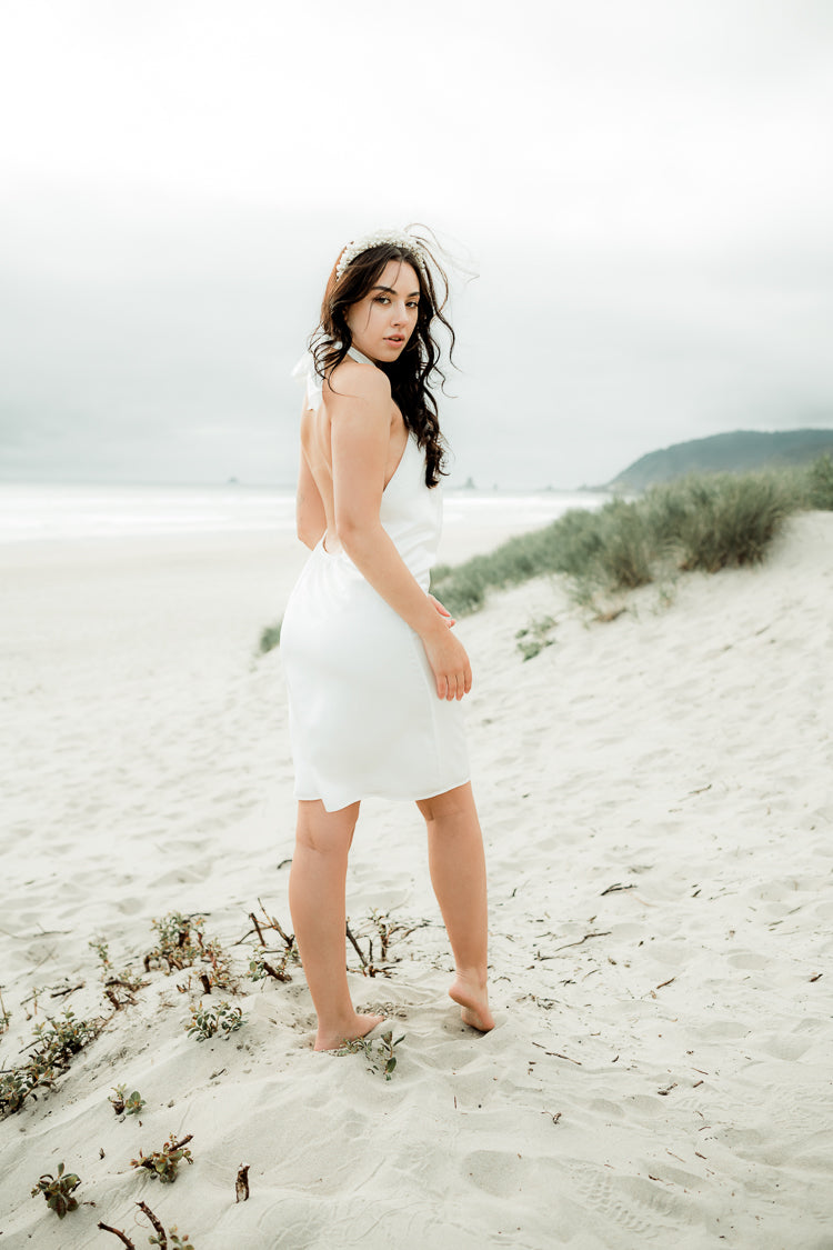 A slinky style made for bachelorette parties and beach wedding events- the Sienna mini dress features a halter style top and low back. Cut from a white silky fabric. Inspired by model Jasmine Tookes' South American garden wedding look, we're pairing with our Marlena Pearl headband.