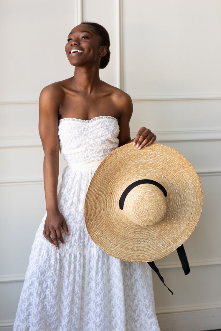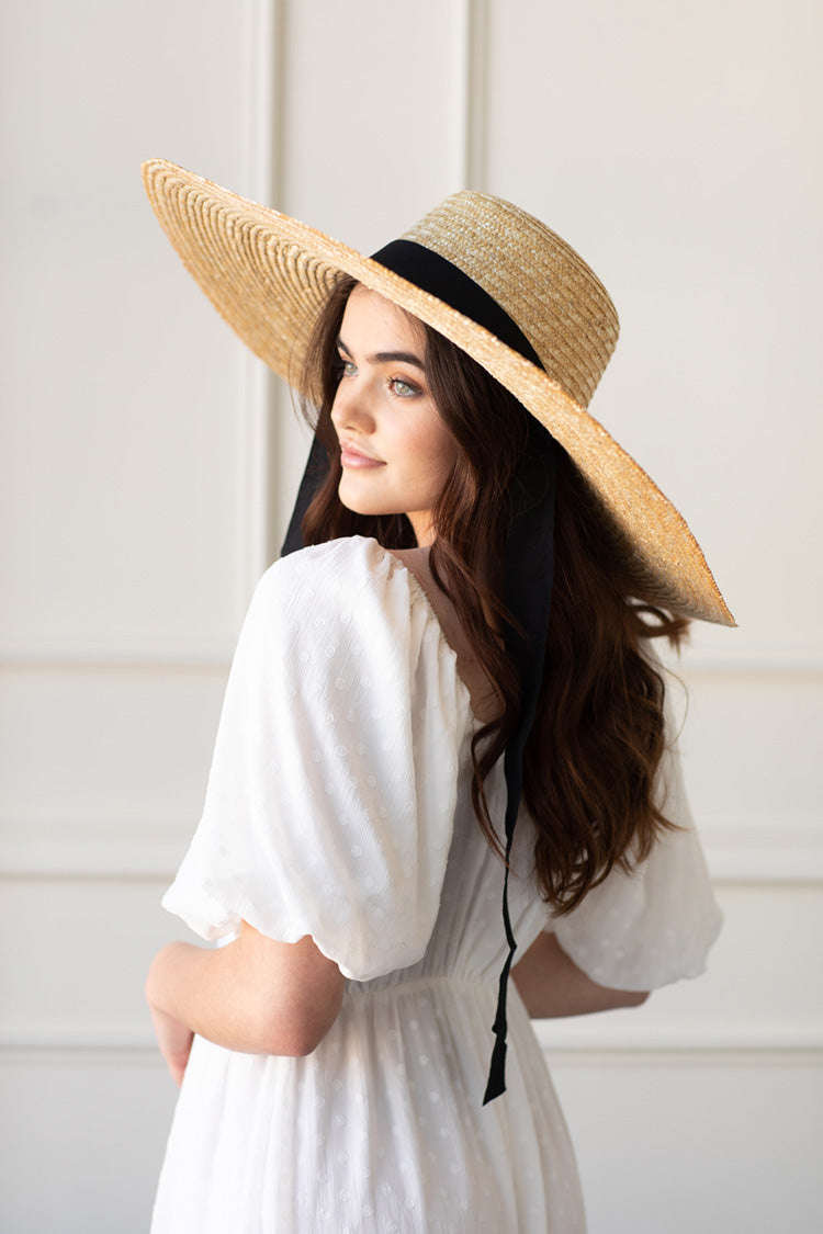 Our Daydreamer Straw Hat makes a sophisticated statement with its wide brim and black grosgrain ribbon tie. This is a Confête favorite when paired with floaty sundresses.