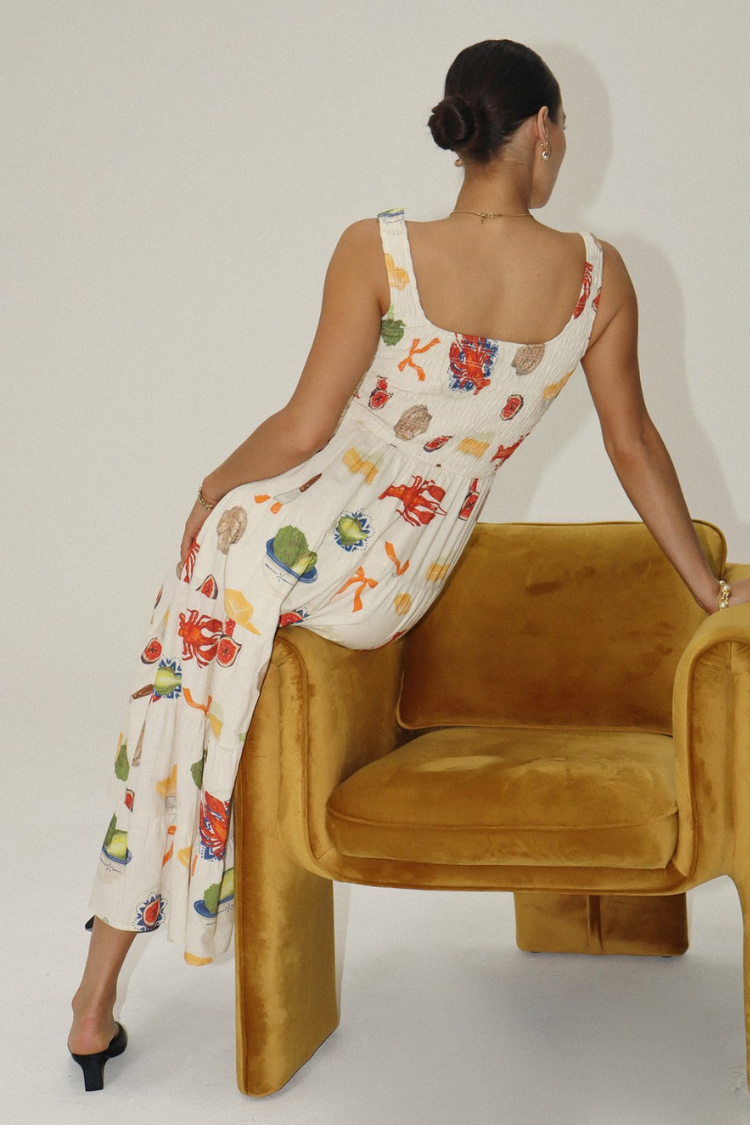 Elevate your summer style with our Amalfi Food Print Midi Dress. Its easy fit and colorful food print fabric scream European summer vibes. The smocked chest and back ensure a perfect fit, while the 100% cotton fabric keeps you cool and comfortable. And graphic prints are THE trend of summer. Limited edition.
