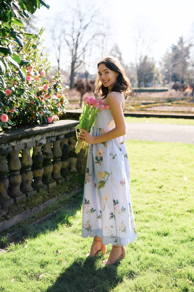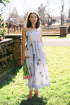 That colorful wildflower print on crisp periwinkle blue poplin fabric is doing all the work for you, while the elastic waist gives you an easy and comfortable fit and the adjustable straps add a personalized fit. The bow tie back and scalloped bust detail are the kind of thoughtful touches that make people lean in closer. It's the dress that photographs beautifully and feels even better.