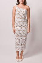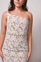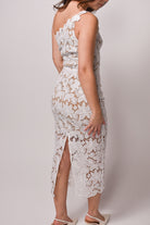 The stunning one-shoulder silhouette creates a modern asymmetrical moment while intricate floral crochet lace blooms across every inch of the fitted midi length. The slim-through-hips design with scalloped hem details hugs your curves beautifully, while the semi-sheer lace overlay adds just the right touch of allure for your special moments.