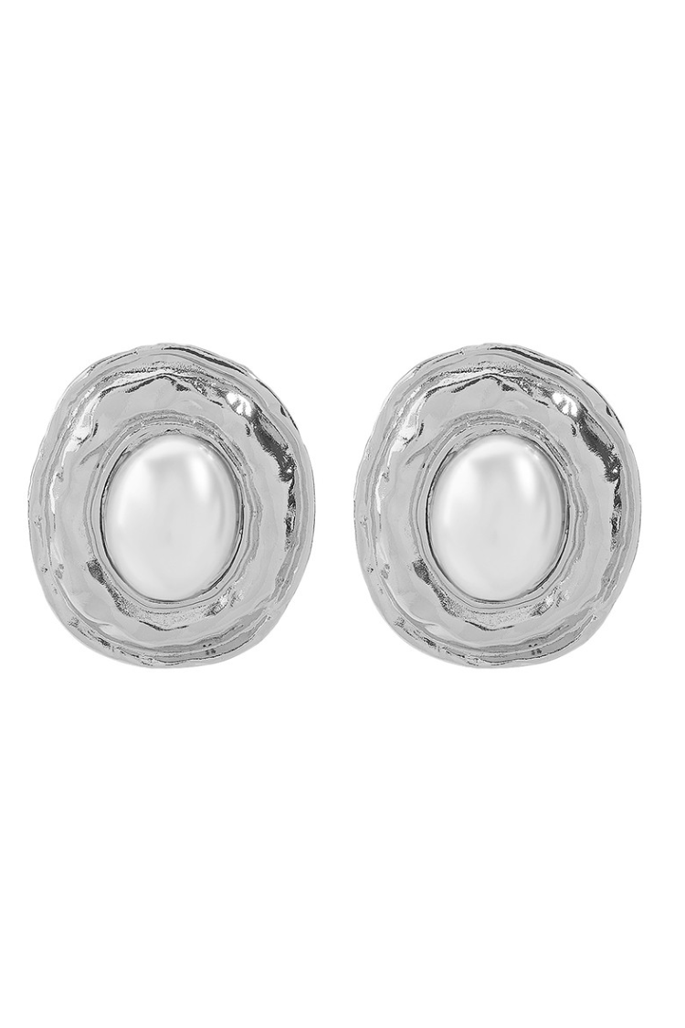 If you're looking for a bold yet classic earring to pair with just about everything, check out the Julia Silver Pearl Studs. These stunners bring a modern twist to a classic look with its imitation pearl in a hammered silver setting. Post closure.