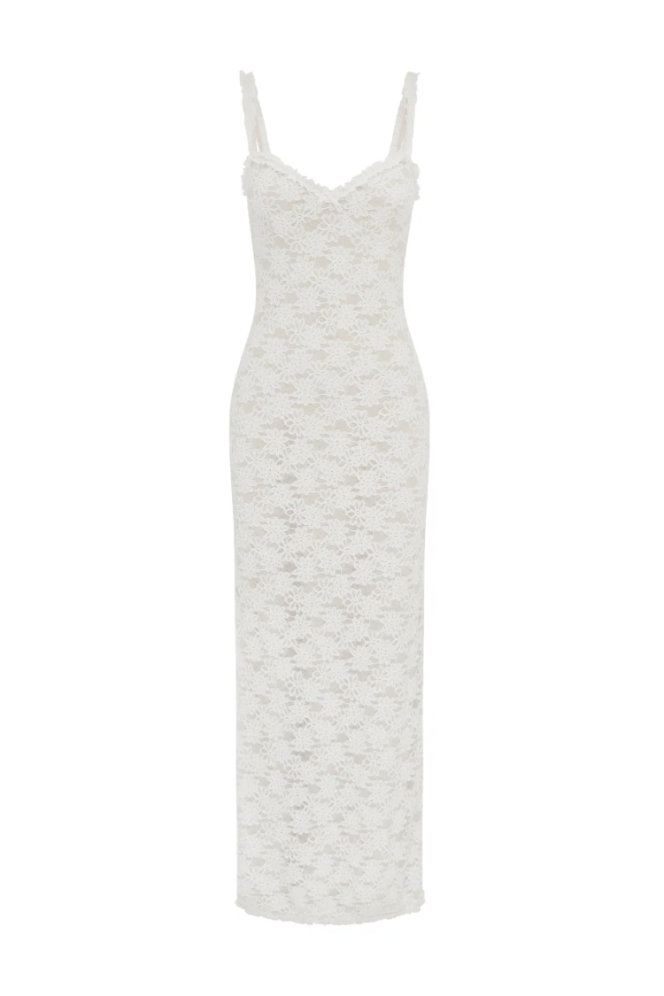 maxi length / slip on style / lined with stretch / white lace dress / shoulder straps