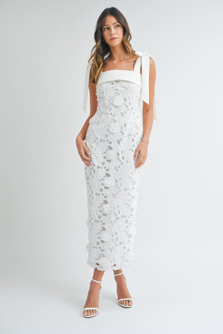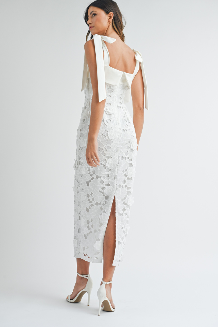Be the blushing bride-to-be in the Ariana White Lace Column Dress! This classic bridal shower dress features a lace midi design with playful shoulder tie details. The hidden zipper back adds a touch of elegance to this fun and flirty dress. Perfect for your special day!
