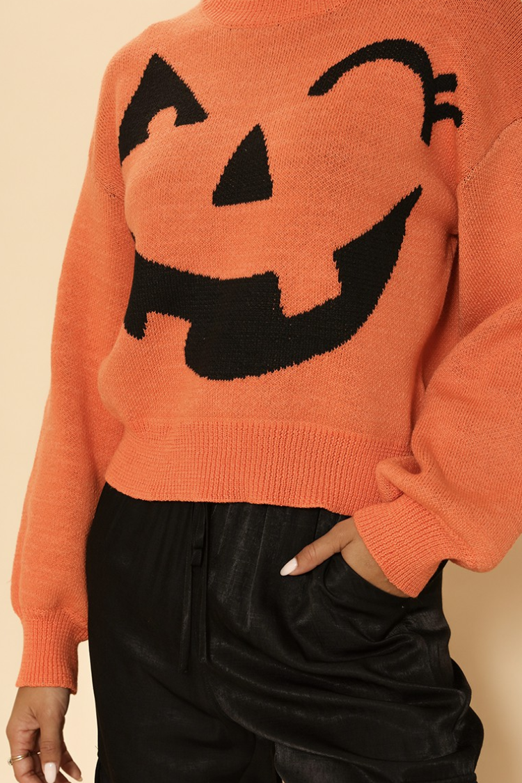 Time to stock up on your Halloween sweaters! This classic orange pumpkin sweater features playful winking pumpkin stitching. Crewneck sweater. Blouson sleeves. Slightly cropped. Perfect for adding a touch of festive fun to your wardrobe.