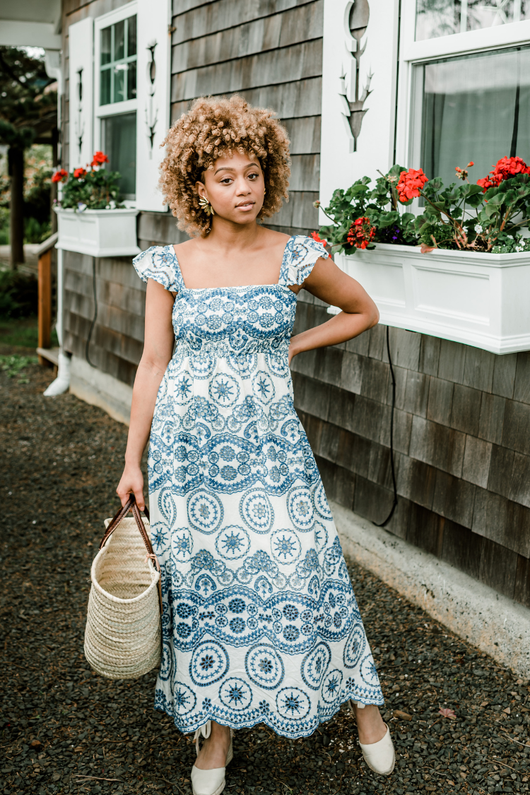 This is the dress we're wearing all summer long - meet Marisol! Cut from a beautiful blue and white eyelet fabric, this multi-tasking midi features a smocked bodice, frilled shoulders and a classic a-line skirt. Its small back cutout gives it a modern twist. We're pairing with wedges and our Lily Floral earrings for our next night out.