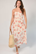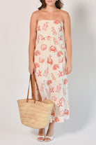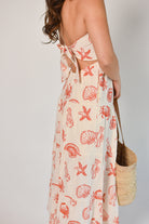 The strapless bandeau top has just enough structure to feel secure while the tiered skirt create that perfect breezy movement that photographs beautifully. The whimsical coral lobster and seashell print walks the line between playful and sophisticated – fun enough to show your personality, refined enough for a nice dinner. The tie-back detail and elastic smocked bodice mean comfort isn't sacrificed for style.