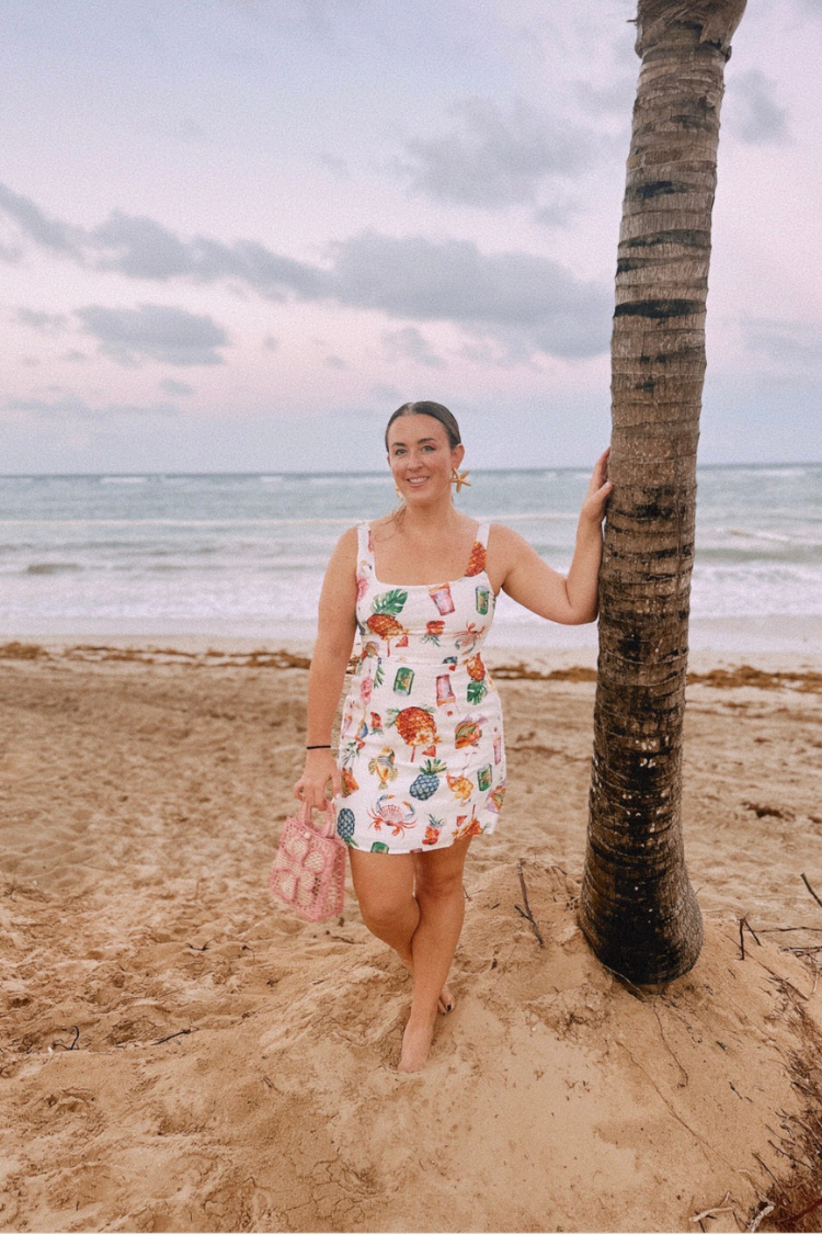 Named by our customers on Instagram... introducing the "Penelope Cruise 🚢" Tropical Mini Dress - the perfect white micro mini for the summer and vacation season! Cut from a lovely colorful tropical and shell print fabric and features a smocked bride. Style with delicate accessories for the ultimate vacation outfit