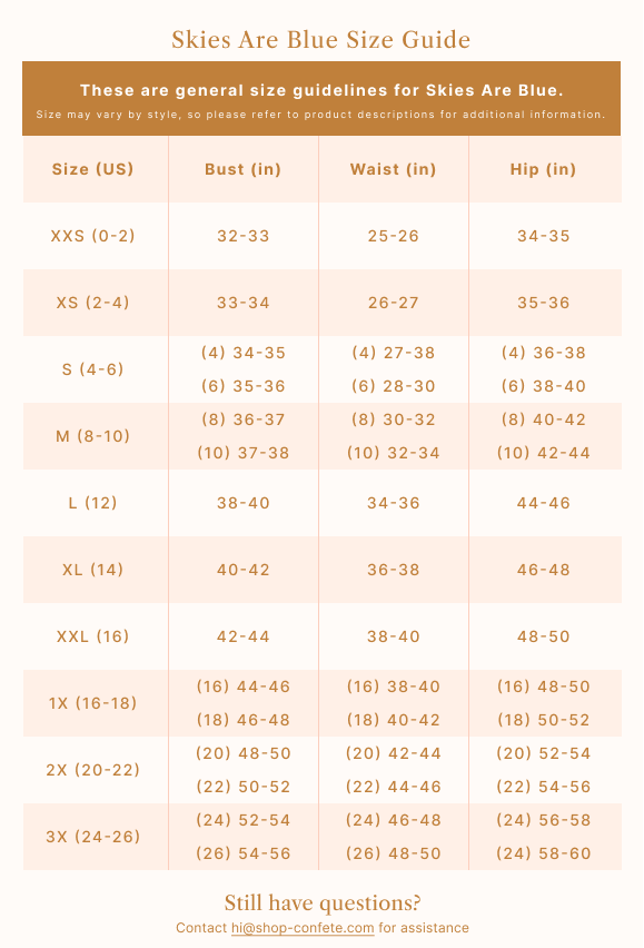 Please check out our sizing tips on every product page for more detailed help on an item or email a stylist at hi@shop-confete.com for more information on how a particular item fits.