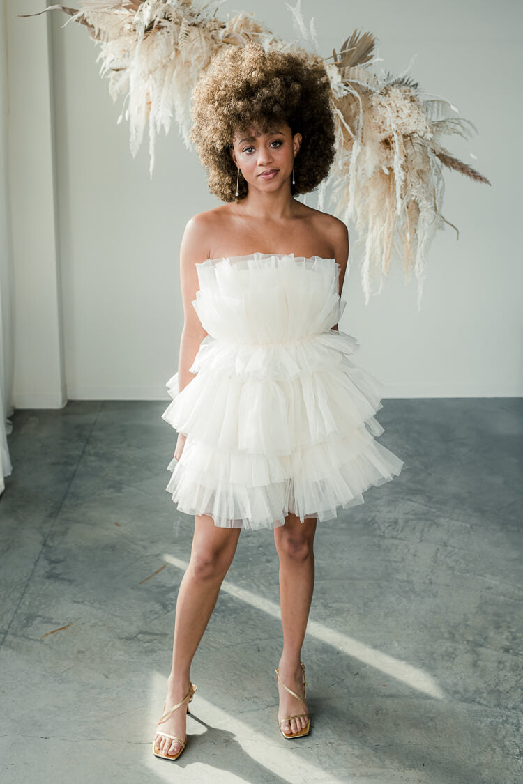Equal parts off-beat and feminine, the Waldorf Tulle Mini is the ultimate party piece. Available in both cream and blue, this style features a slimmer silhouette adorned with tiers of delicate tulle. Hits mid-thigh. Inner lingerie band helps this strapless style stay in place. Elasticized waist.