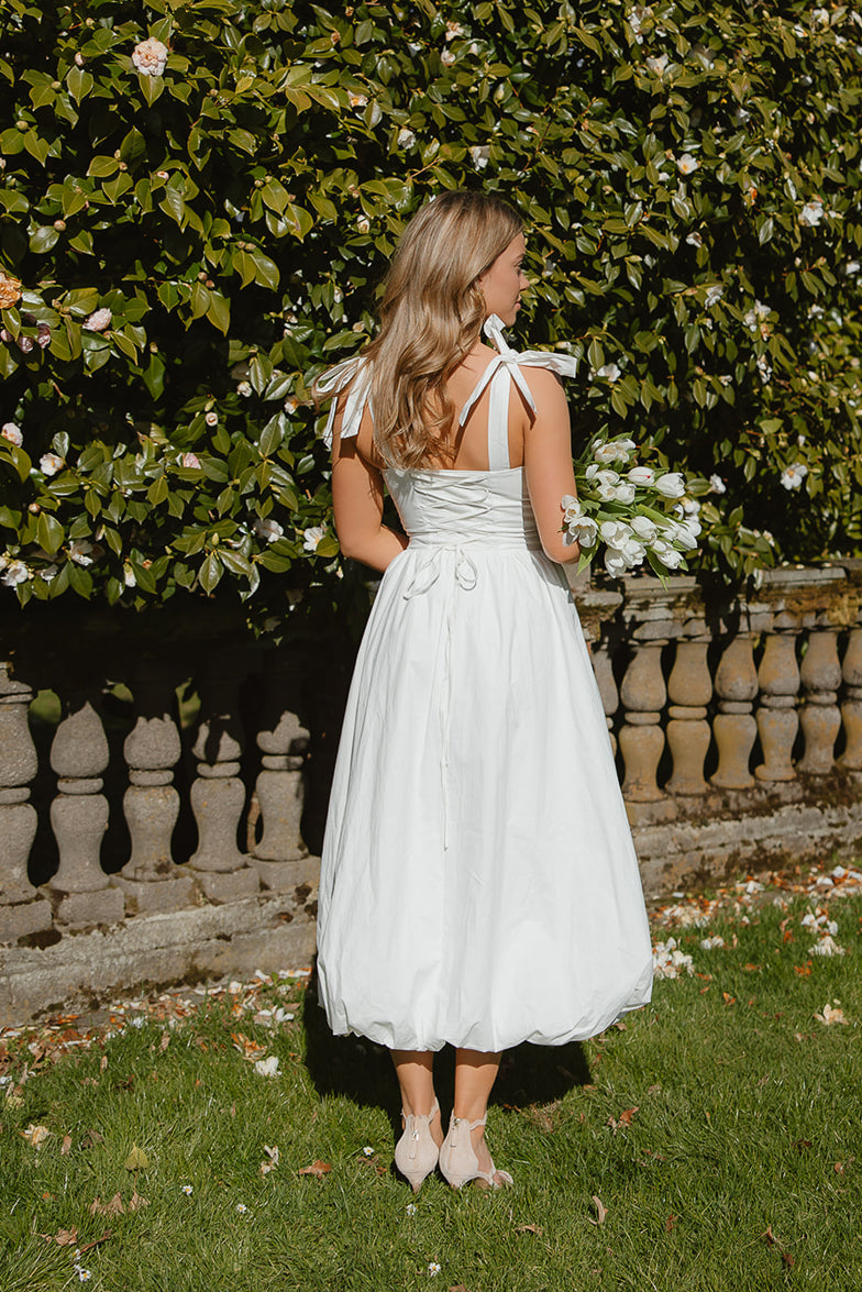 Looking for that perfect bridal shower or graduation dress that you can wear time and time again? Meet the Tayla dress - a dropwaist bubble hem midi that's flattering and feminine. This crisp cotton poplin dress features a dropwaist that gives you that perfect hourglass figure, adjustable bow tie shoulders and a playful bubble hem. V neckline. Pintuck and lace up detail on the back to give you the perfect fit. Hidden side zipper