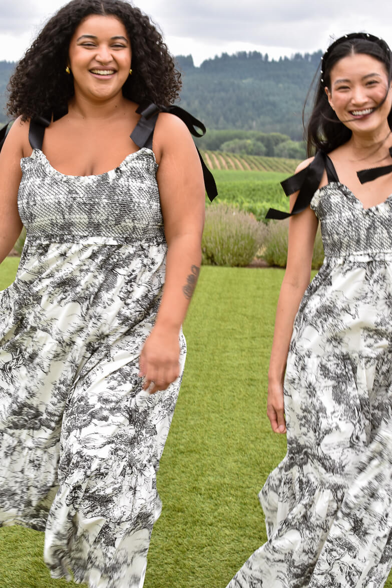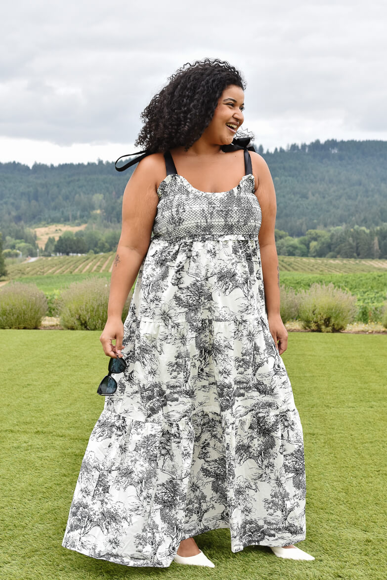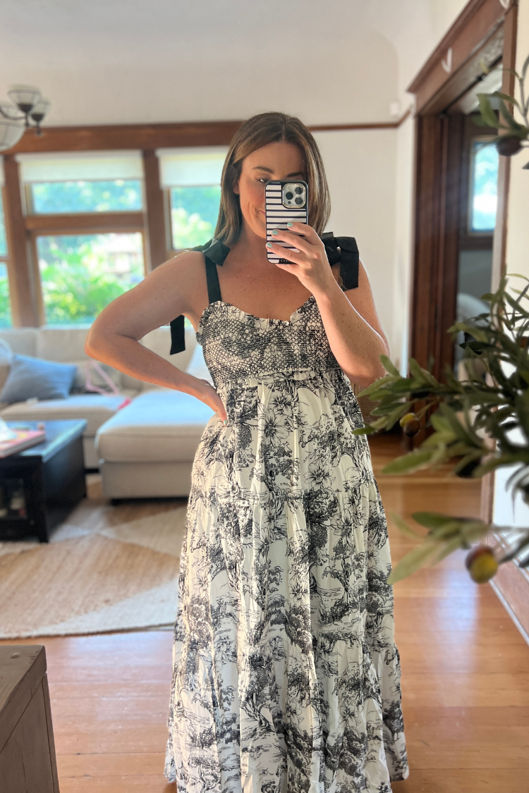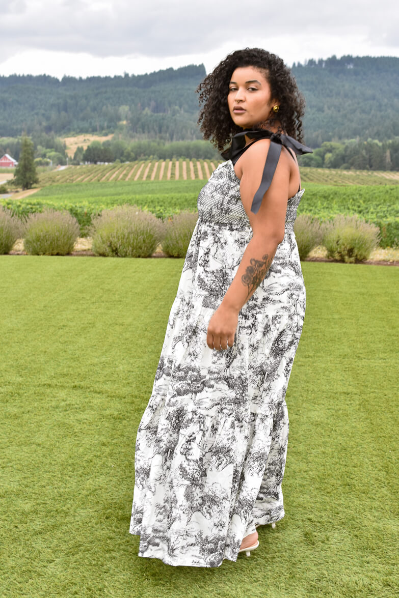 Elevate your transitional style with the Beatrice Black and White Toile Maxi Dress. Featuring a black and white toile print fabric and playful black bow tie shoulders, this is the must-have silhouette of the season. Available in sizes S-3X, this size inclusive style has a smocked chest and flowing maxi skirt. Wear with swept back hair and wedges for the warmer summer months and toss on a cardi and boots when the temperature drops this fall.