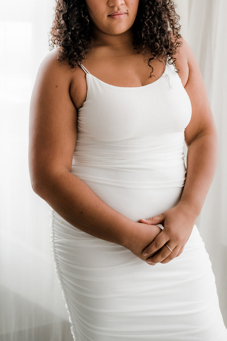 The ultimate little white bodycon dress for plus size brides. The Sam Midi Dress is cut from stretchy, mesh fabric and features side and back ruching to flatter every body type. Spaghetti straps. Hidden zipper back. This is a style you can truly make your own.