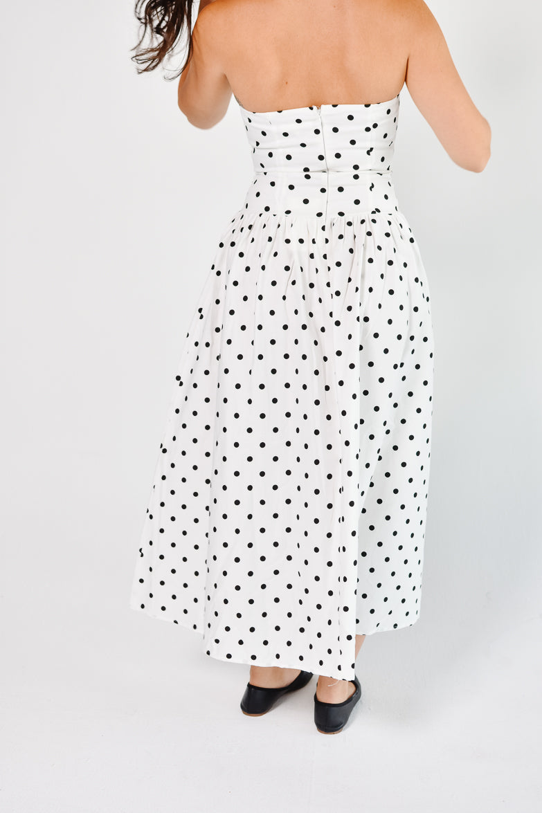 La Dolce Dot Strapless White and Black Polka Dot Maxi Dress