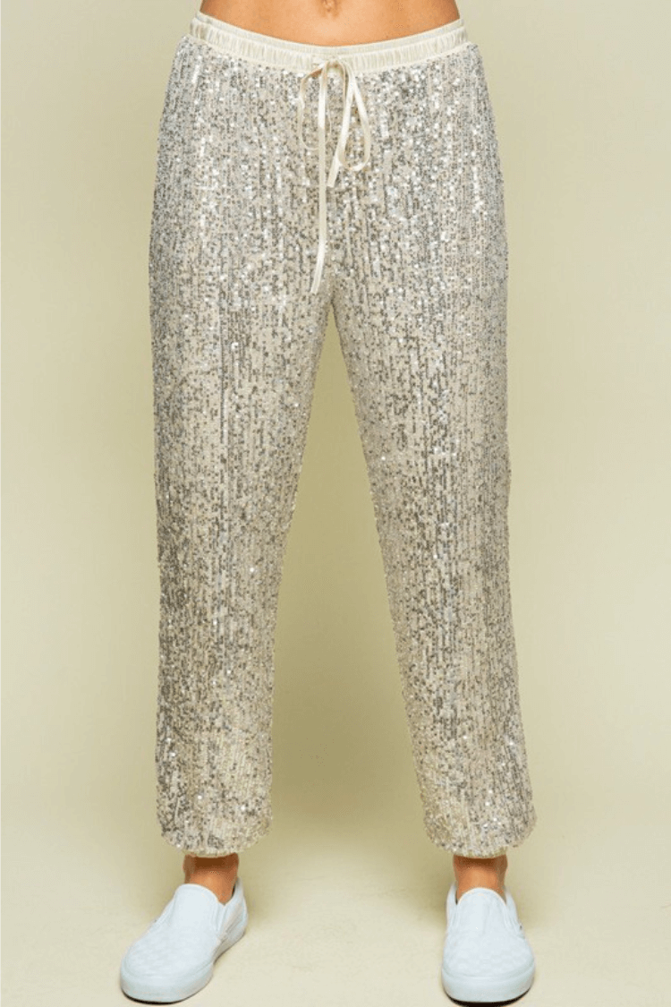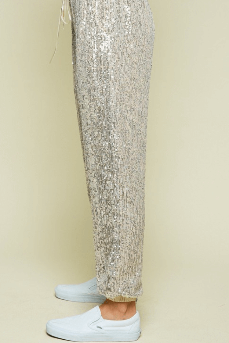 The party piece of the season - our Quinn Champagne Sequin Jogger pants.  Cut from a glimmering champagne sequin fabric, these jogger style pants feature an elastic bowtie waist, elastic ankle cuffs and pockets.