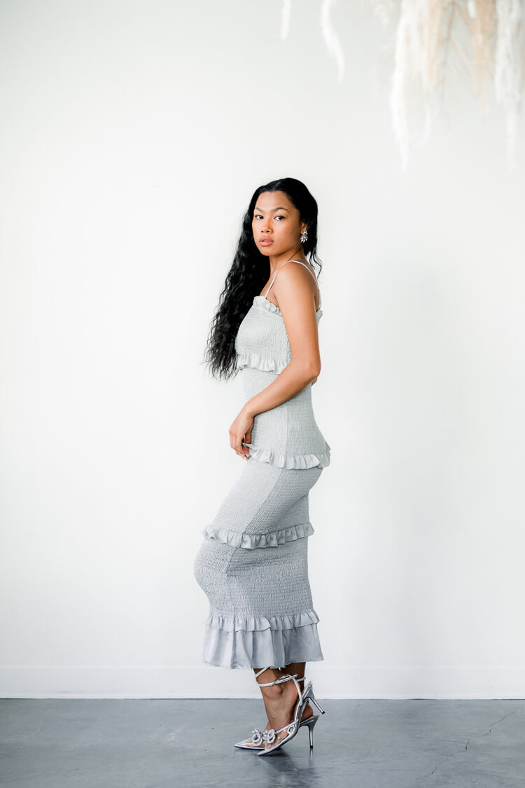 Tiered ruffles and soft ruching make the Bowery Dress both sexy and stylish.  Cut from a silky sage fabric, this style hits mid-calf.  Pair with heels and glittering earrings for your next date night out.