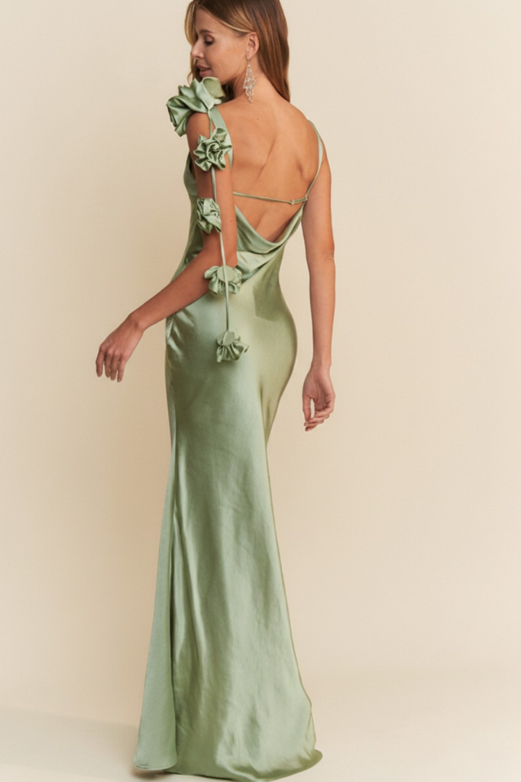 Lana Cowl Back Gown with 3D Floral Trim - Sage Green