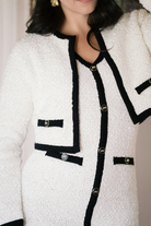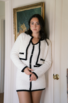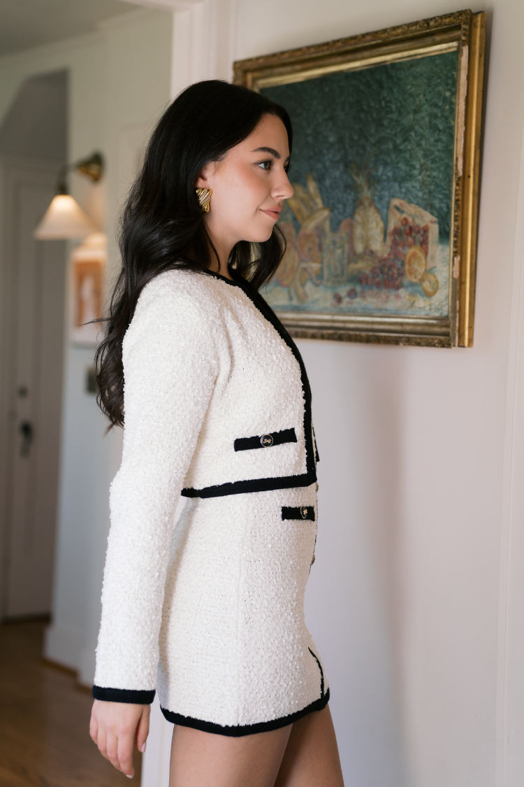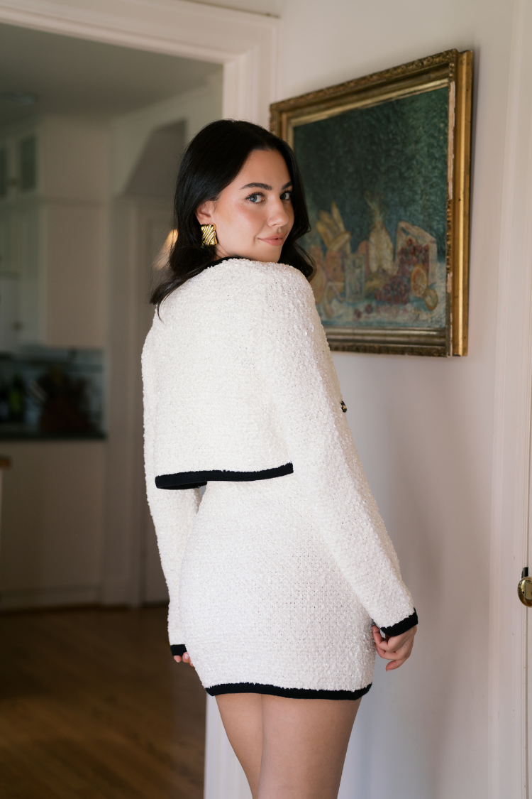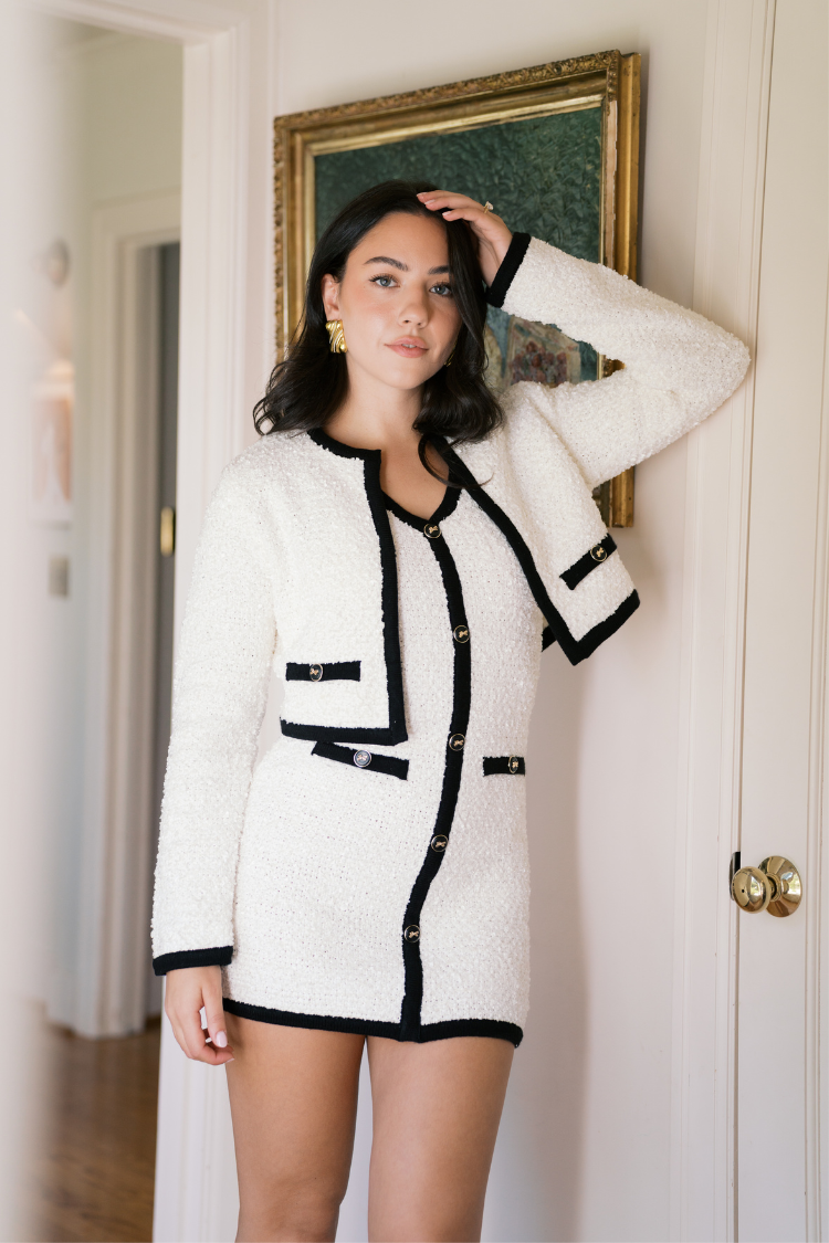 For someone who wants an elevated, polished look for fall or winter occasions without overspending - the Bowery Dress and Jacket Set delivers. Ideal for dinner parties, wedding dress shopping, or anytime you want a coordinated outfit that reads classic and refined, this cream bouclé mini dress with a matching cropped jacket offers a luxe feel and layered versatility.