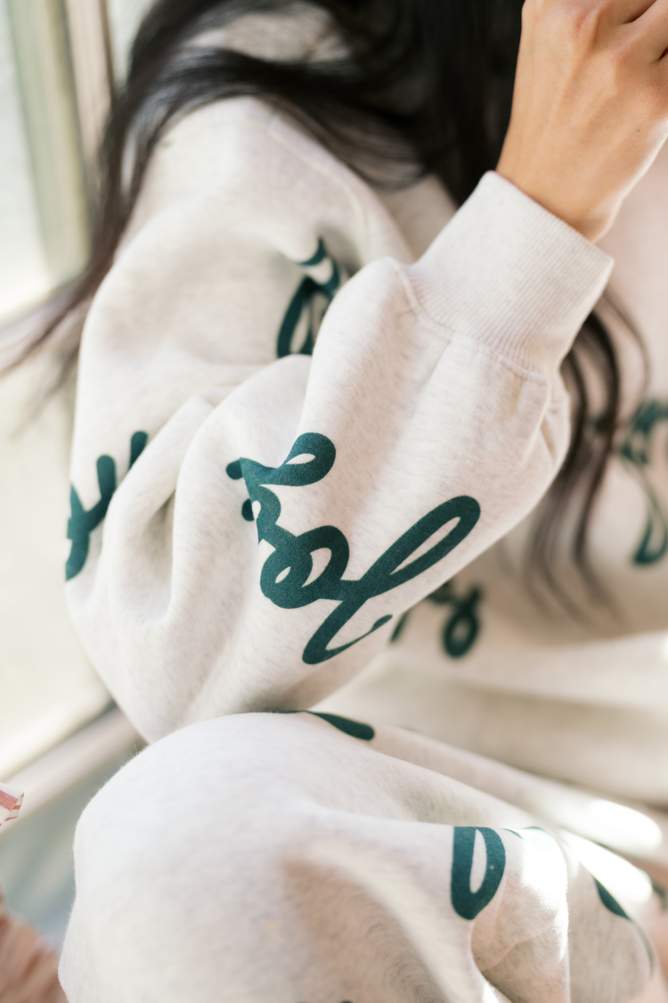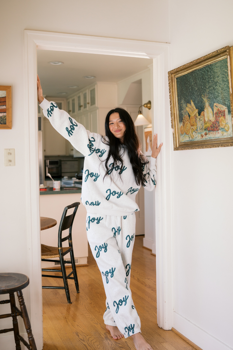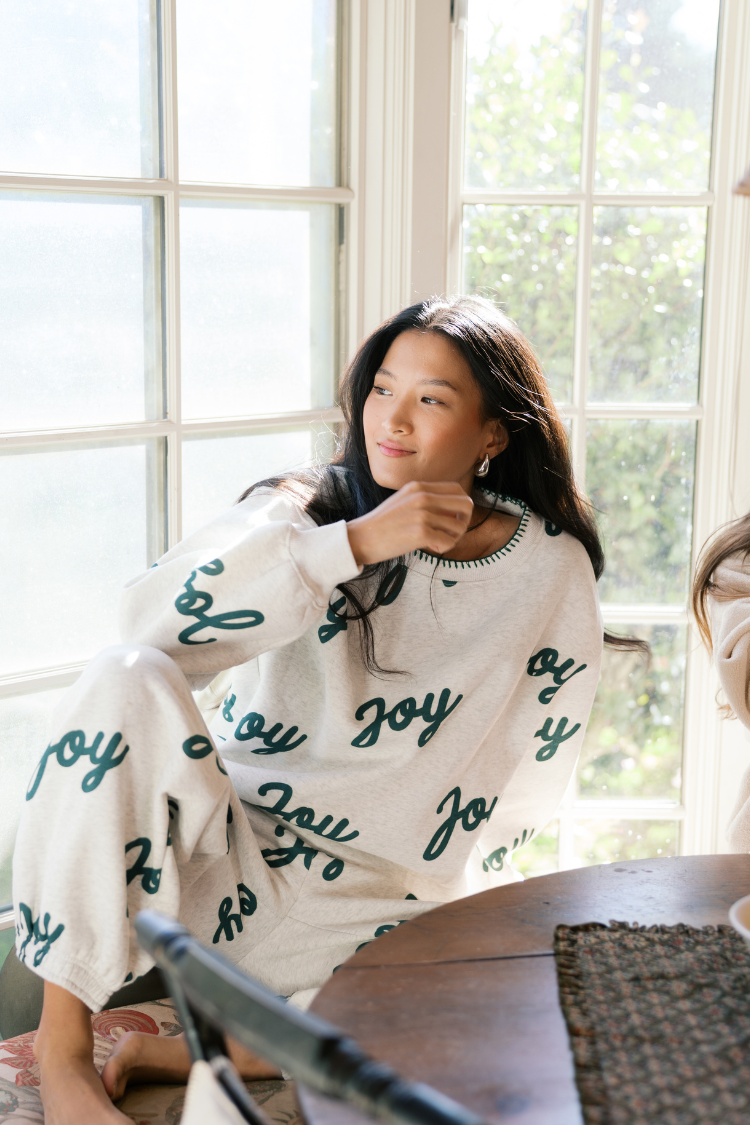 Perfect for anyone who wants a cozy holiday sweatshirt and sweatpants set to wear all over town - from running errands and cozy brunches to nights in. The Joy Jogger Set gives you a soft, put-together look that reads comfortable and festive without trying too hard.
