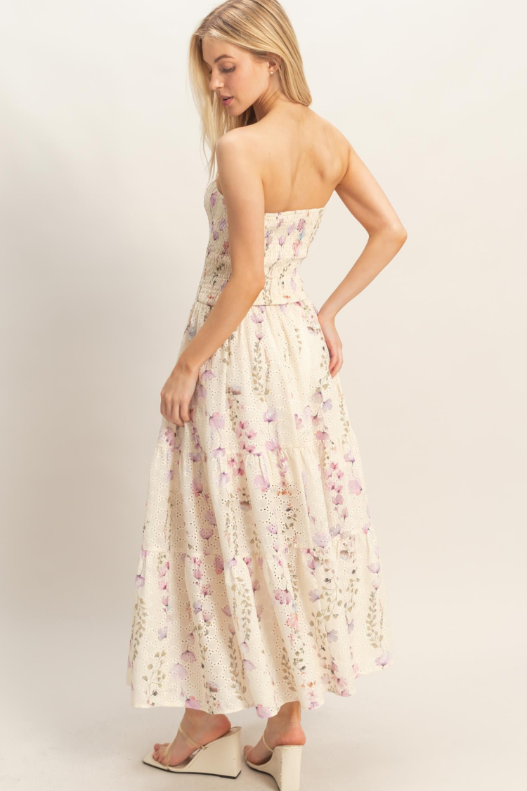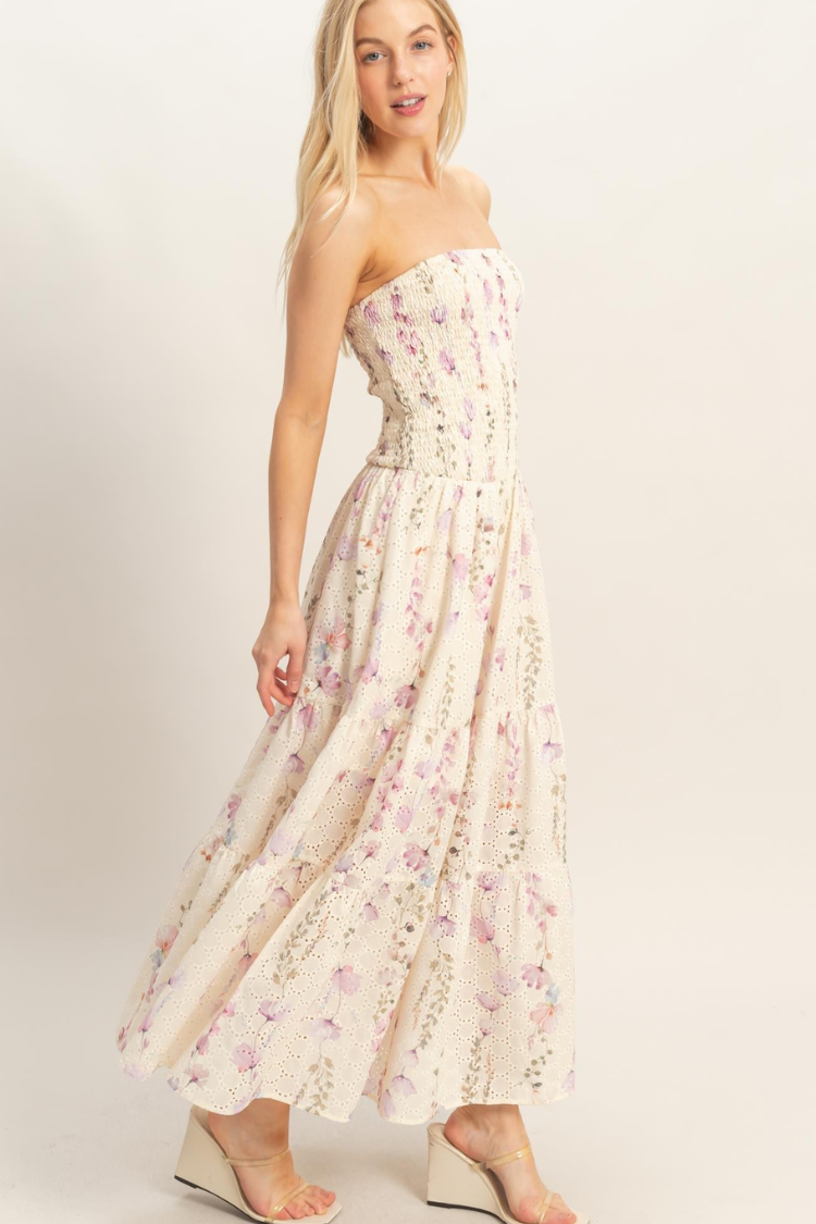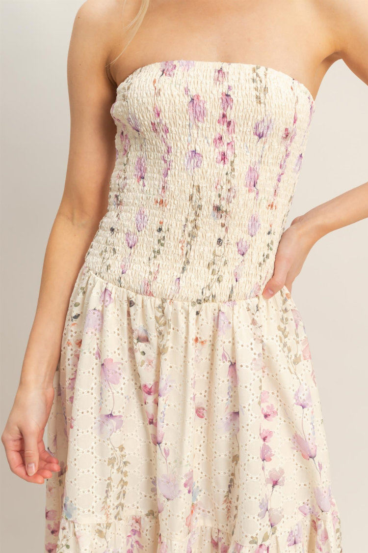 Romantic, feminine, and effortlessly elegant, the Meadow Floral Print Midi Dress is the perfect piece for sun-filled spring and summer occasions. Designed with a flattering strapless smocked bodice, this dress hugs comfortably through the top while allowing for an easy, flexible fit.