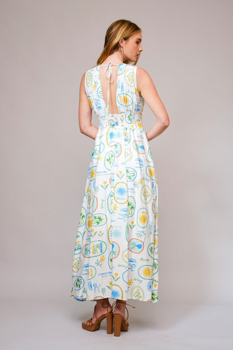 Nothing says vacation like a playful print! Our Fun in the Sun Maxi Dress is a classic white maxi dress with an all-over colorful travel stamp print. V neckline and slightly open back with adjustable ties to give you the perfect fit. Smocked waist at the back. This is THE dress of summer.