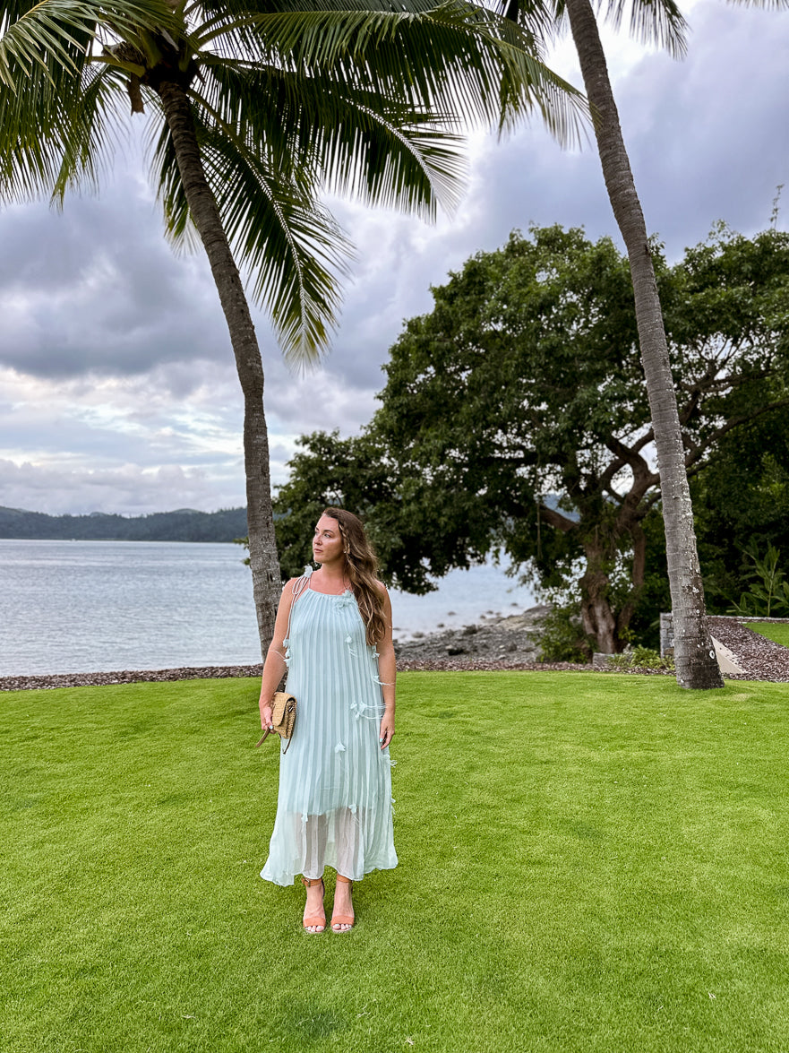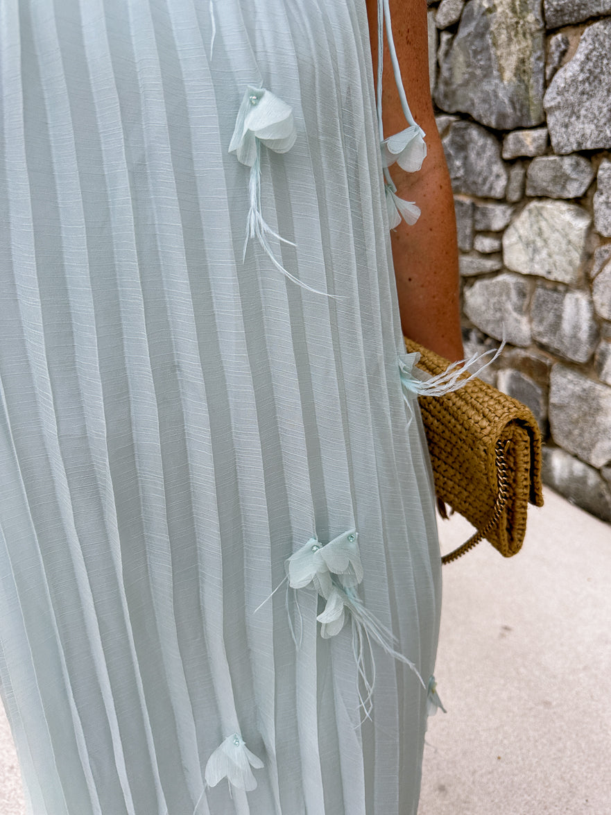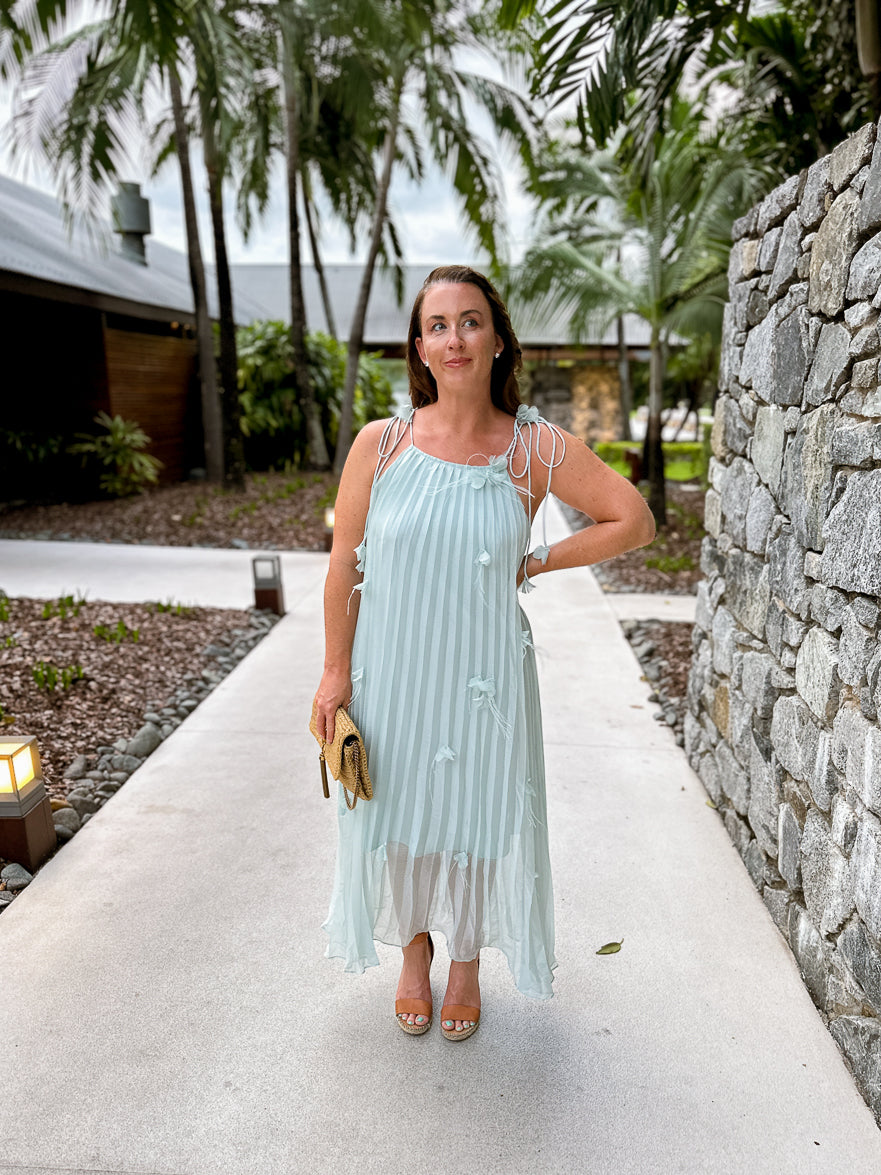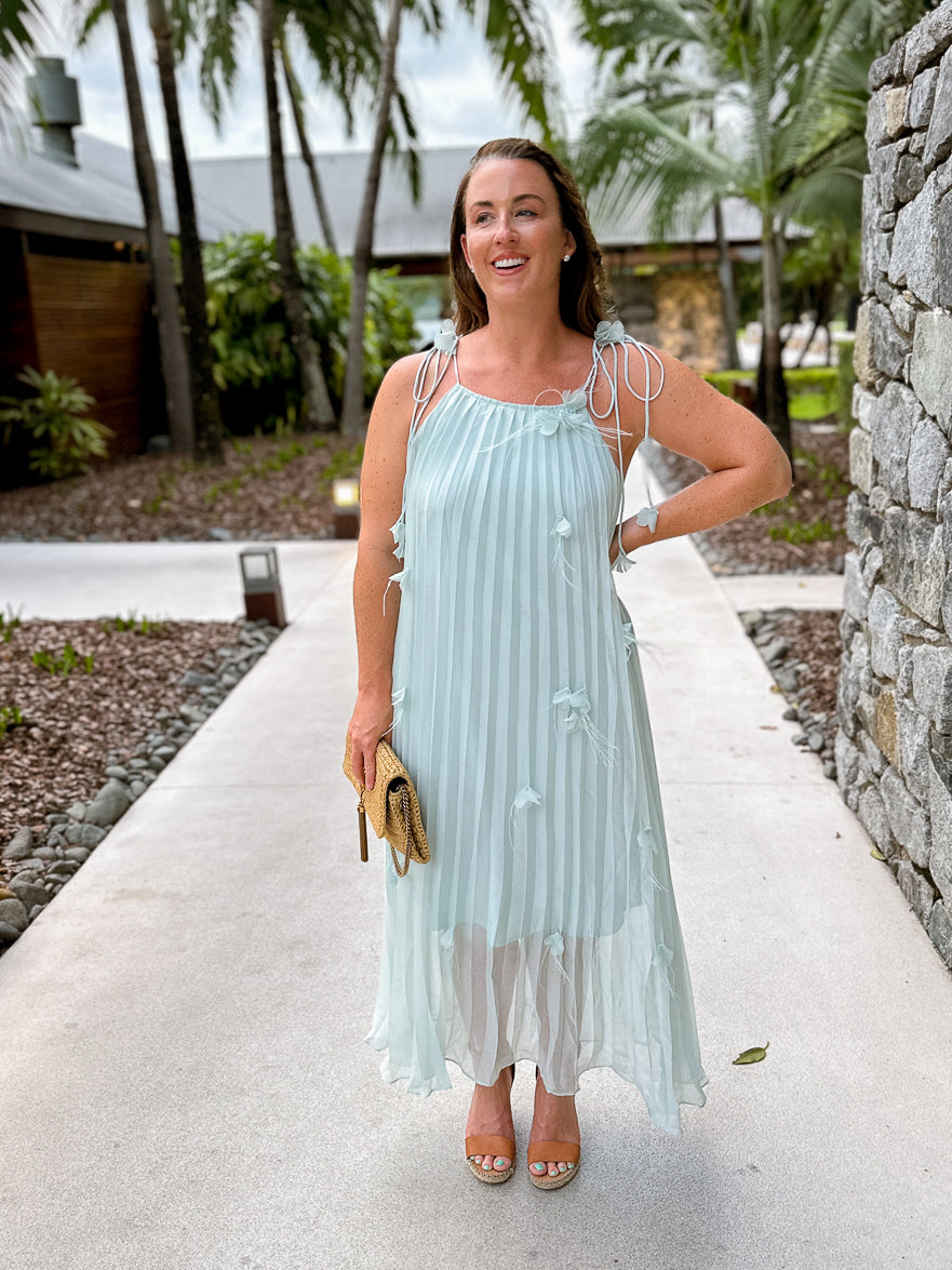 This midi dress is perfect for your next event!  From its soft sea glass teal fabric to its delicate 3D petal details on the body and shoulder ties, this dress is sure to turn heads.  Available in soft teal and cream.  The pleated fabric and shoulder ties give it a feminine feel.   We love this for a spring or summer wedding guest dress or something chic and stylish on your next vacation.  This beauty is part of our Destination Drop, shot on location in Australia!