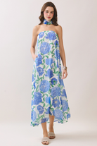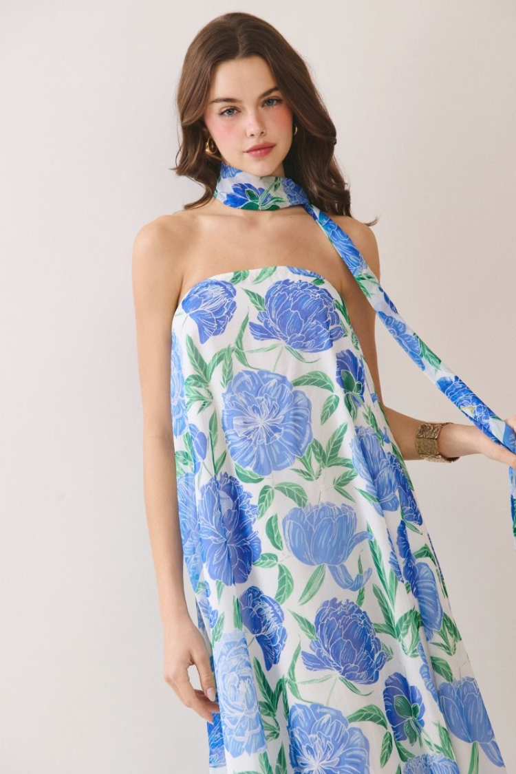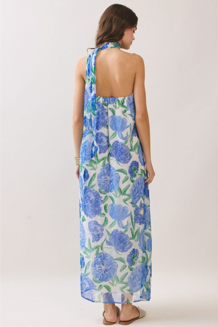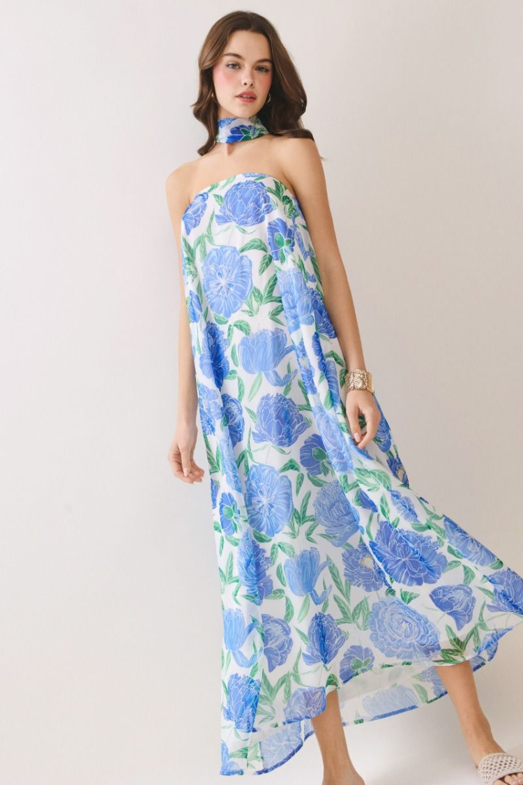 Peony Dreams Maxi Dress with Neck Scarf - Blue Floral