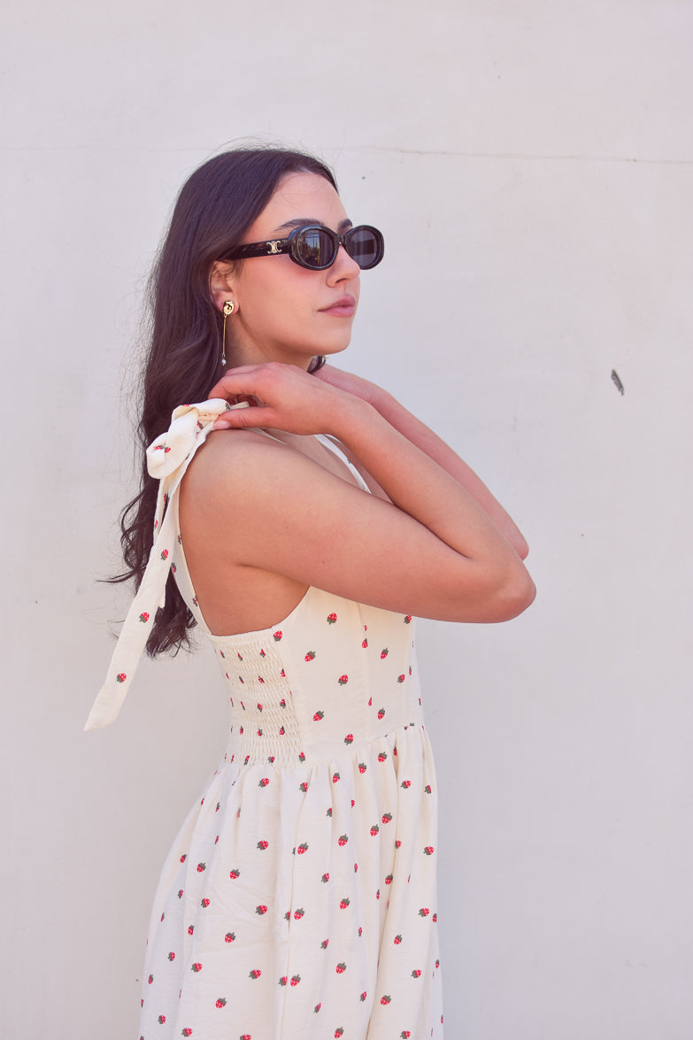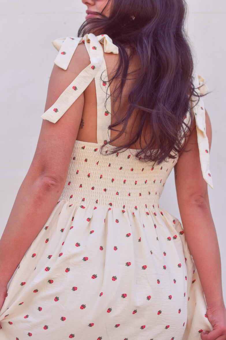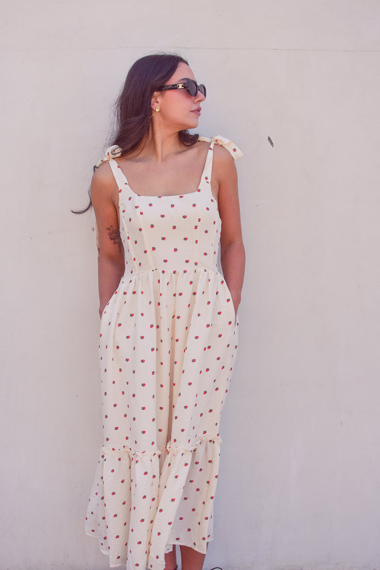 If you're looking for the ultimate summer statement dress, meet our Strawberry Fields Midi Dress! This classic graphic print dress features a playful strawberry print on cream fabric. Adjustable shoulder bow ties and a smocked back give you a personalized fit. Corset/ boning details in the front cinches your waist comfortably. Midi length. Pullover style. Pockets. This is THE dress for your next vacation or brunch.