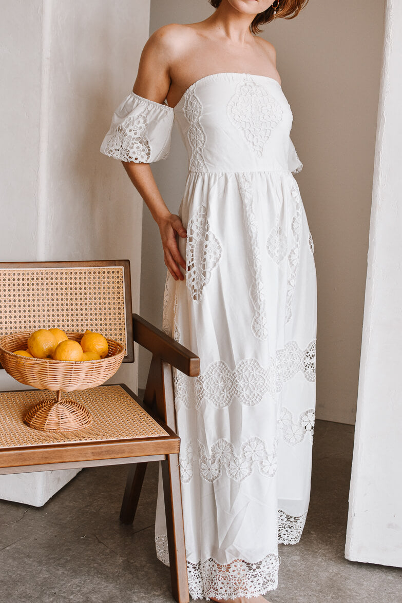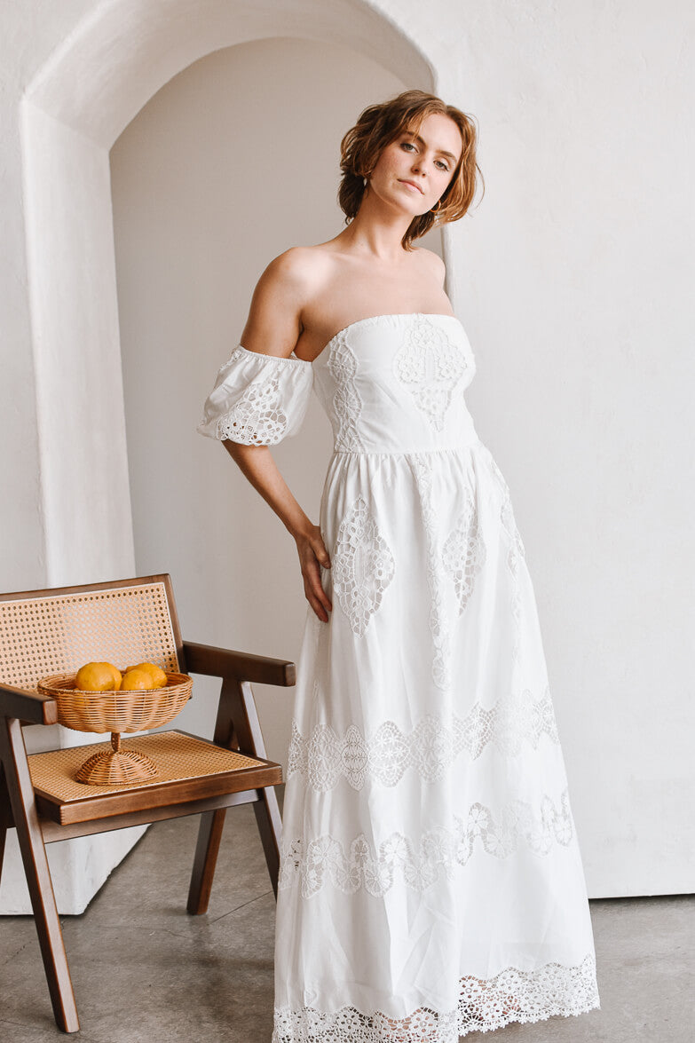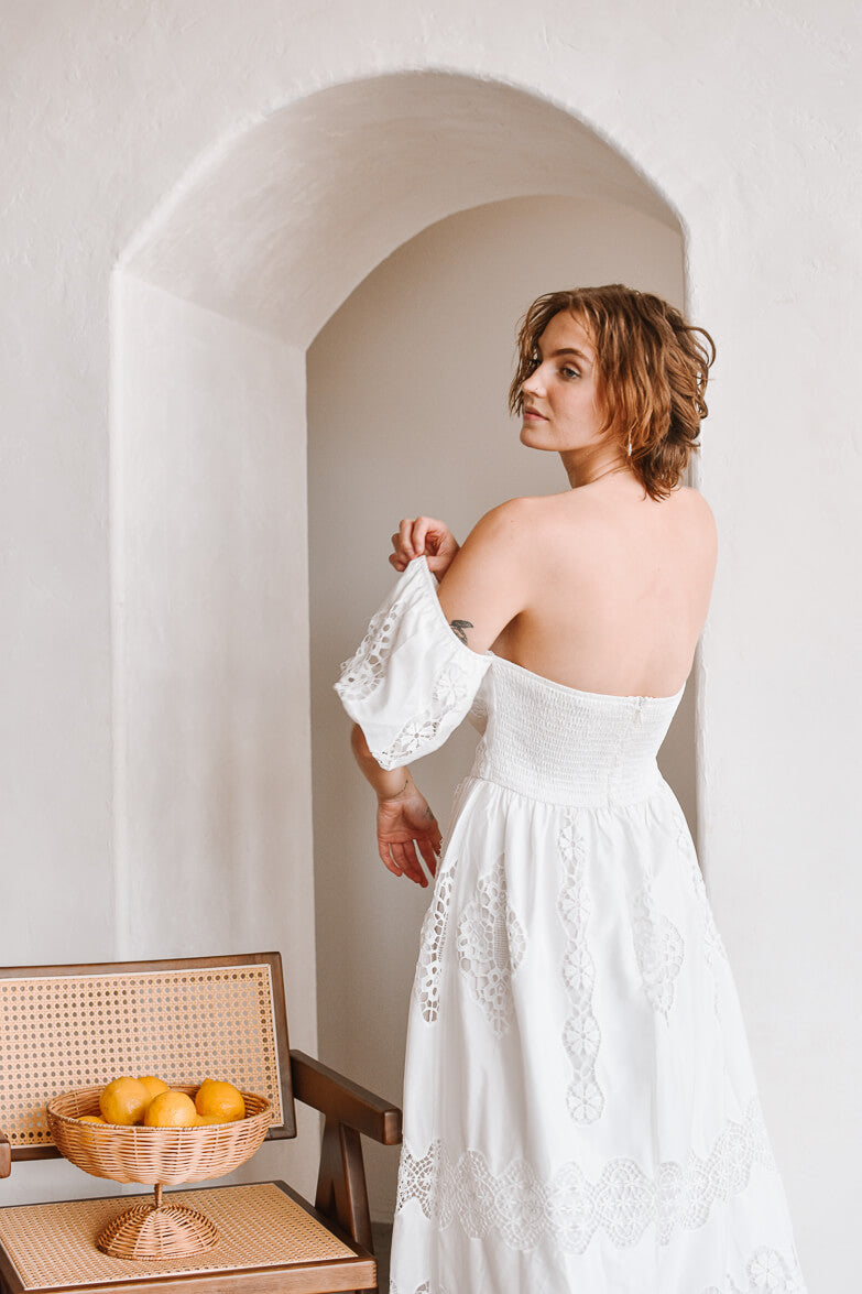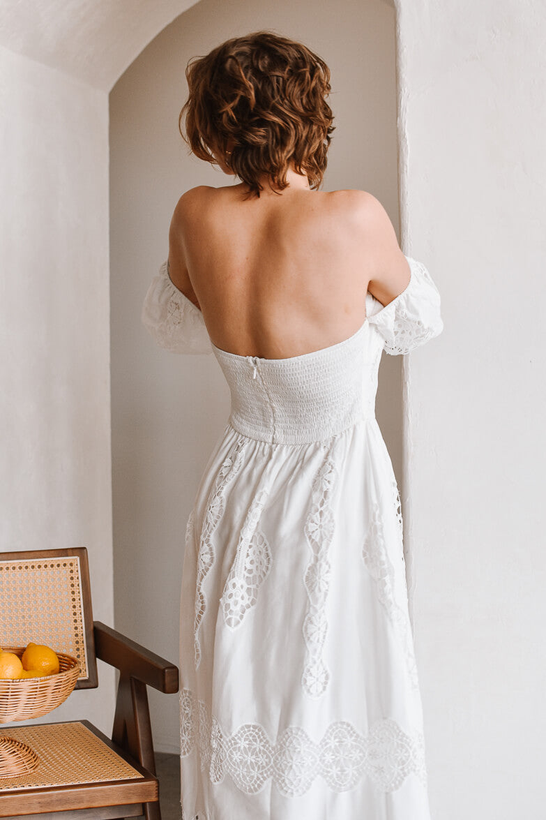 The dress that is made for our boho brides! Meet Mustique - an off the shoulder white maxi dress, adorned with delicate lace detailing throughout. This is one of the most romantic dresses you'll ever wear. From its soft puff sleeves to the lace detailing, this maxi dress is perfect for a wedding welcome party or honeymoon. Smocked back and hidden zipper. It's also bump friendly! A gorgeous maternity photo dress for the moms-to-be.