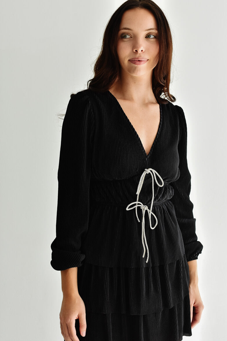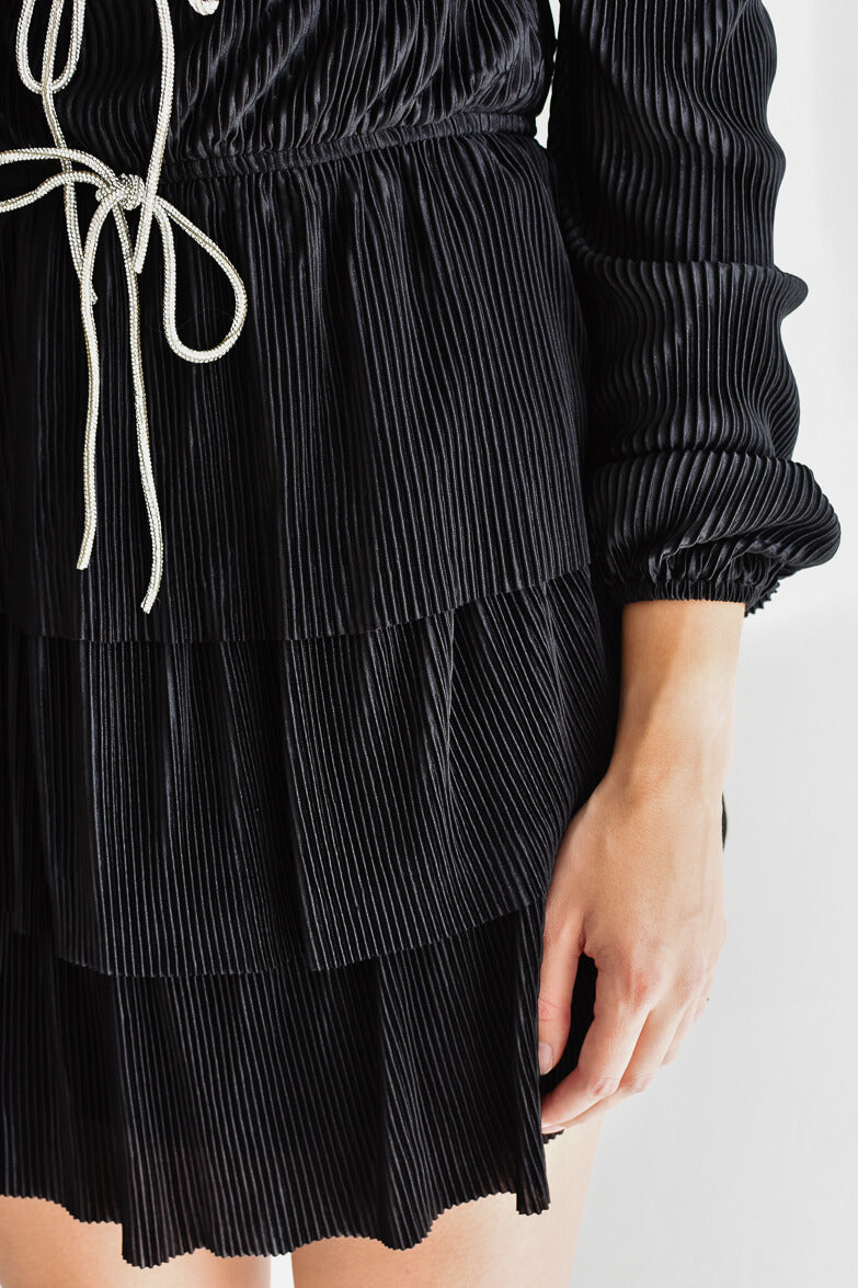 Rhinestone bow details are trending big time - and what better way to try the trend then on a little black dress.  Wren is a long-sleeved mini dress, cut from black plisse fabric, and adorned with decorative silver rhinestone bow ties.  V-neckline.  Pullover style with an elastic waist and tiered skirt gives it that party flair.