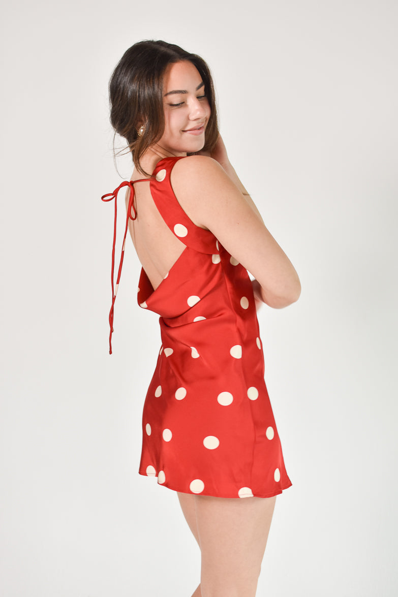 Ready to turn heads on your next night out? Add the Cherry Red Polka Dot Mini Dress to your wardrobe. Shop now at Shop Confete.