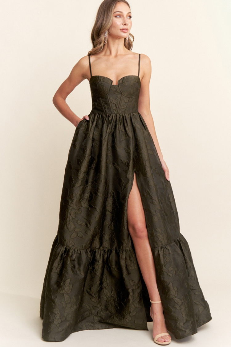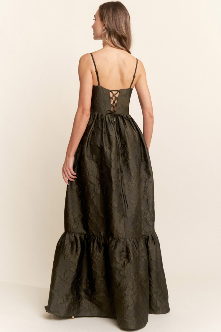 Lana Cowl Back Gown with 3D Floral Trim - Olive Green