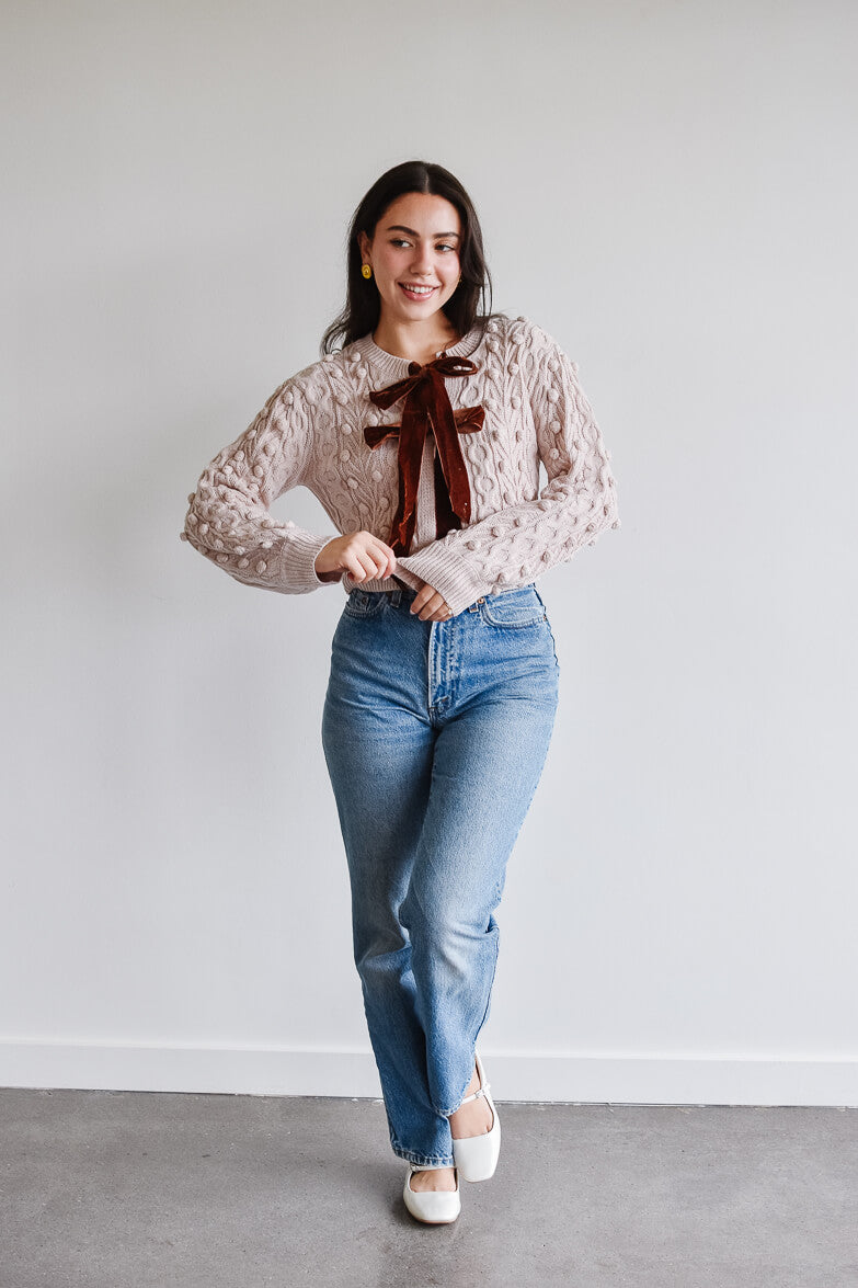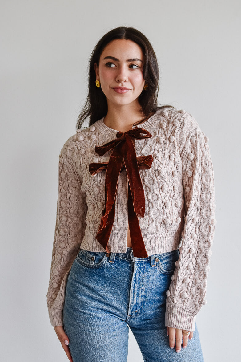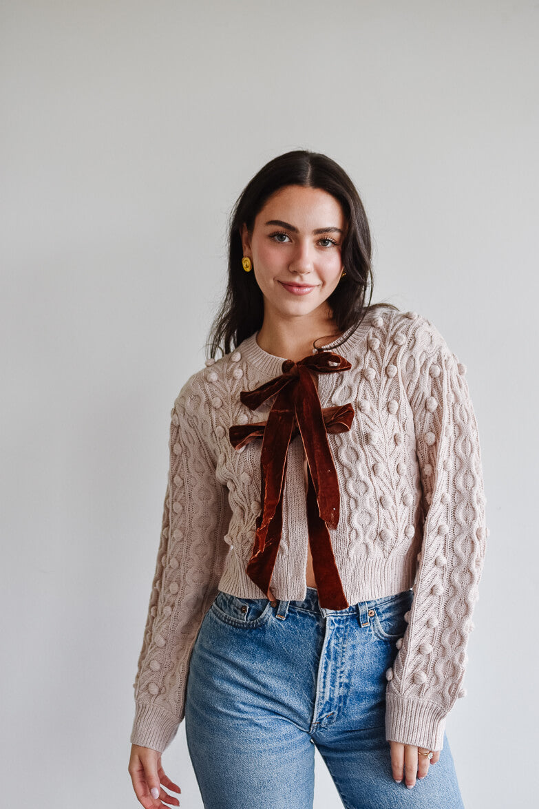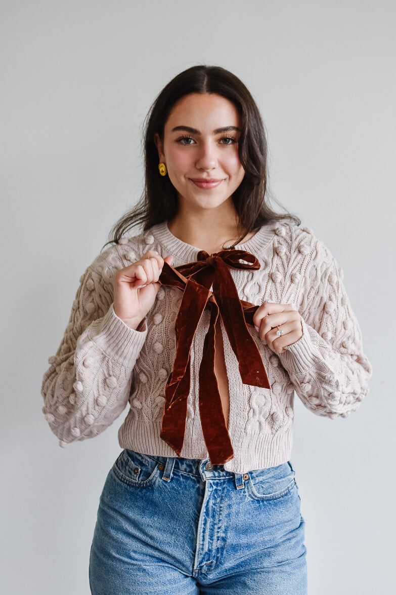 Sophistication meets femininity in the James Velvet Bow Tie Cardigan. This statement-making style features a classic dusty blush cable knit cardi with a delicate brown bow tie closure. Slightly cropped, but not too short. This length makes it perfect for layering over your favorite dress or with you favorite high waisted jeans. To the office, to dinner, this transitional piece piece is our new fav!