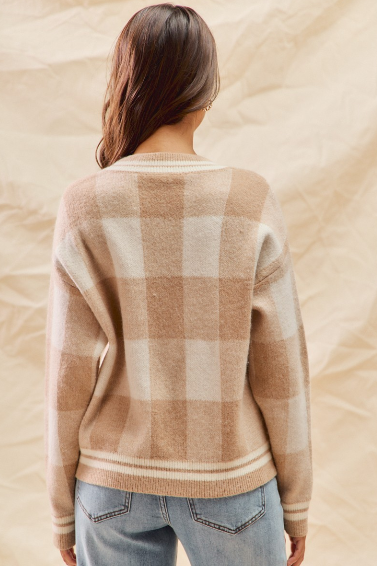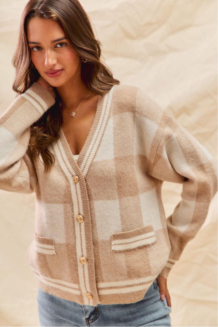 Why Choose Talia Camel and White Checked Sweater - checked cardigan