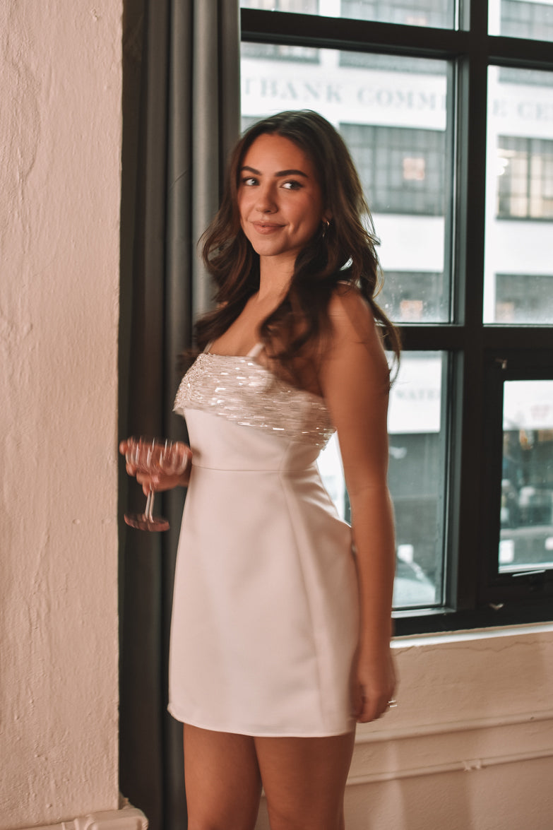 Picture yourself sparkling under the lights at your engagement party or dancing the night away at your bachelorette celebration – this is the dress that makes every special moment feel like a fairytale. The gorgeous beaded bust catches the light with every movement, ensuring all eyes are on you as you celebrate love and new beginnings.