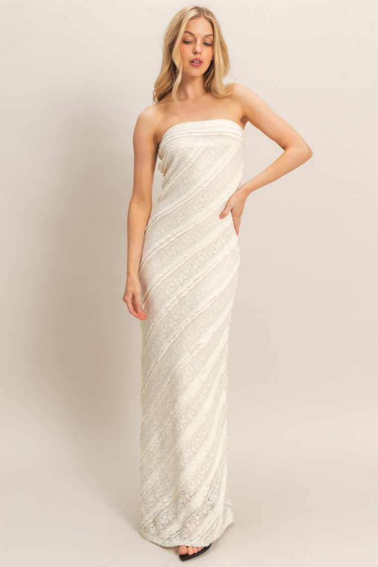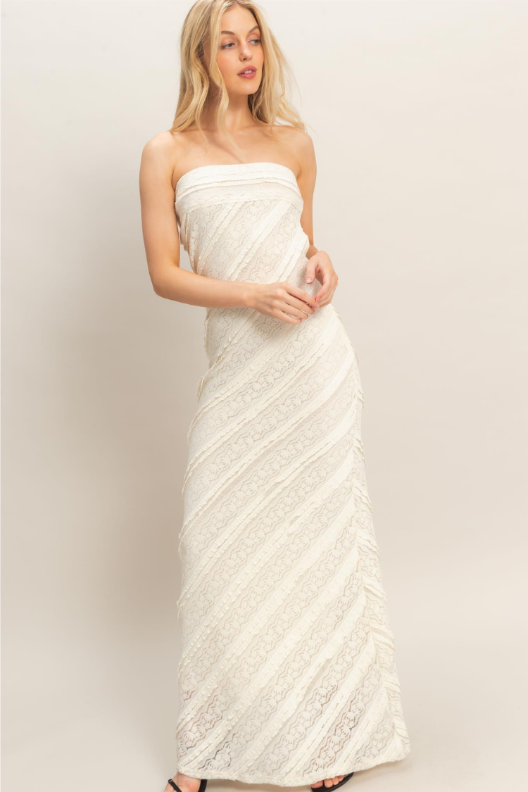 Crafted in delicate ivory lace with soft diagonal paneling, this strapless silhouette gently contours the body while creating a beautifully elongated shape. The straight neckline adds a clean, sophisticated finish, while the intricate lace texture brings just the right amount of softness and dimension.