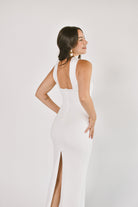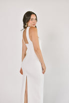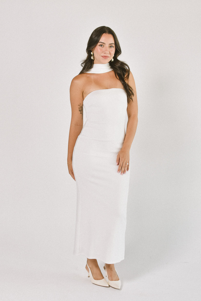 Minimalist meets iconic. The Sweetest Thing White Scarf Detail Midi Dress is designed for every bridal event on your calendar — from a chic rehearsal dinner to your engagement shoot. The sleek, figure-skimming silhouette is elevated with a halter neckline that gives you the look of a neck scarf but in a much more functional fashion.   Ideal for brides who want a polished, high-fashion look.  Hidden zipper back.  Pair with statement earrings and kitten heels for a look that’s unforgettable.