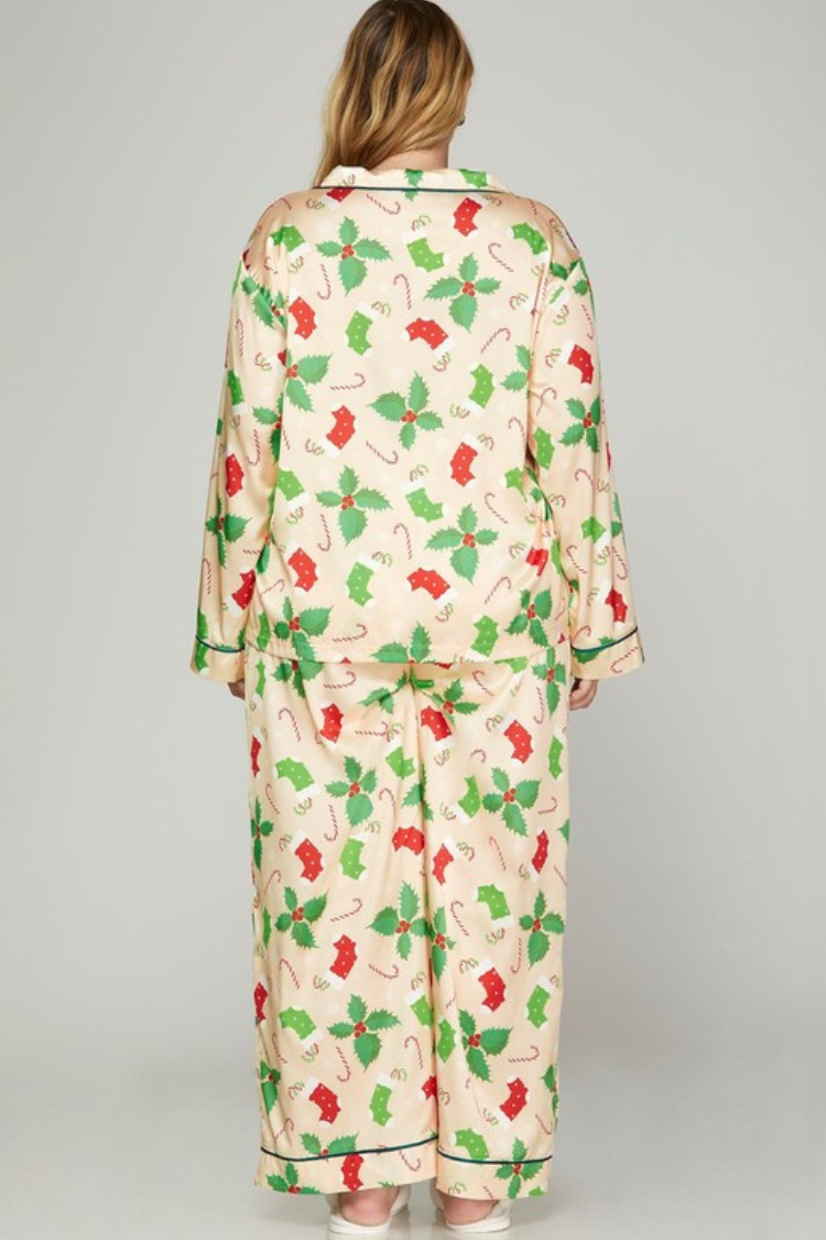The perfect addition to your cozy glam holiday wardrobe.  Our Holly Jolly Holiday Plus Size Pajamas feature the most delightful candy cane, stocking and holly leaf print on soft, satin-y fabric.   Wear this decorating cookies or watching a festive movie!  Classic button down pajama shirt.  Elastic waistband on the pants.  Set is sold together.