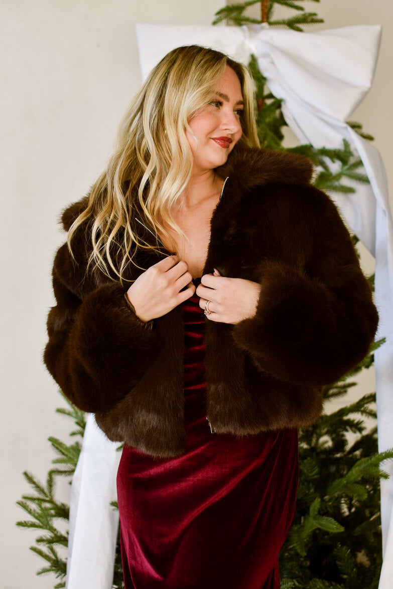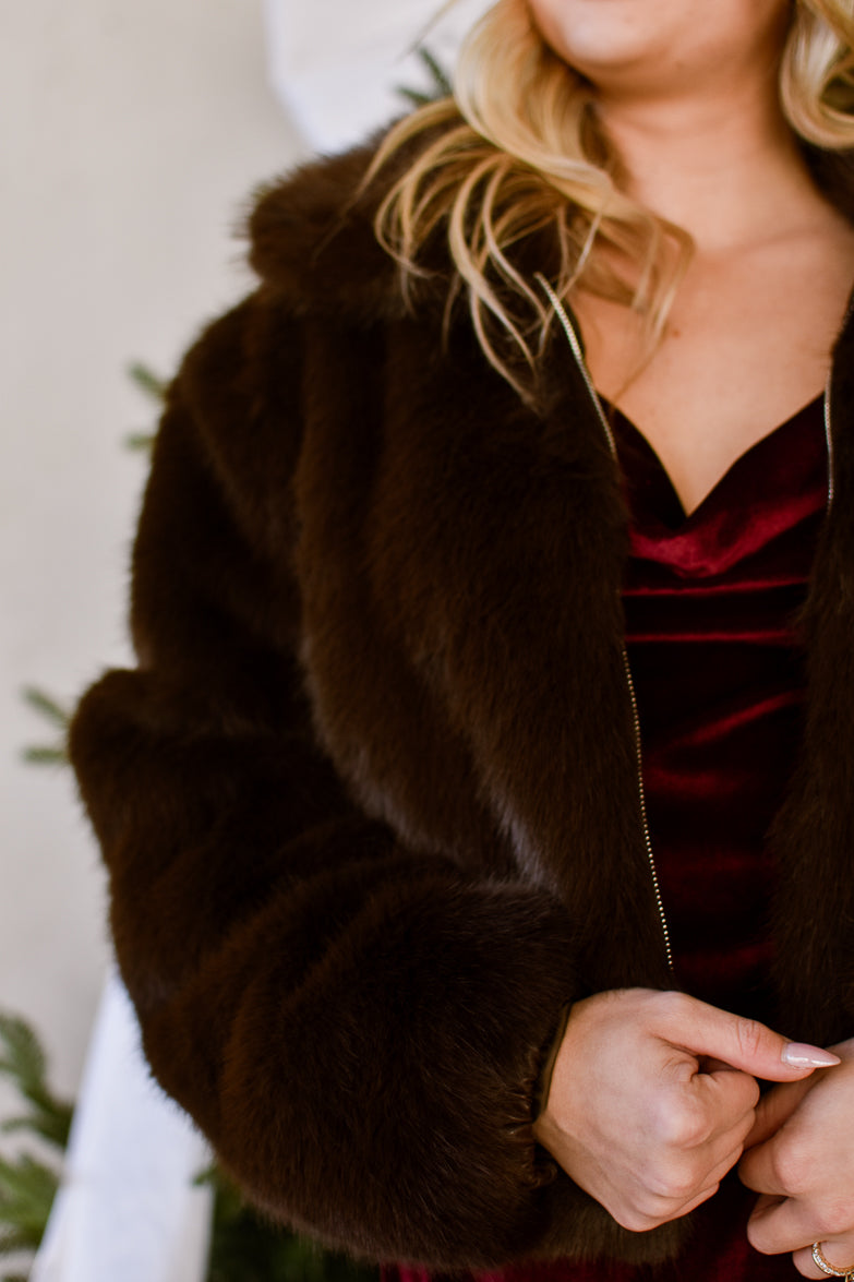 Soft and fluffy - just in time for the colder months! Just because you have to get out of bed doesn't mean you can't be cozy and cool. The Nia Faux Fur Bomber jacket features the most plush mocha faux fur. Elastic waist and wristbands. Front zipper closure. Pockets. Lined. We're wearing this on all of our holiday travels!