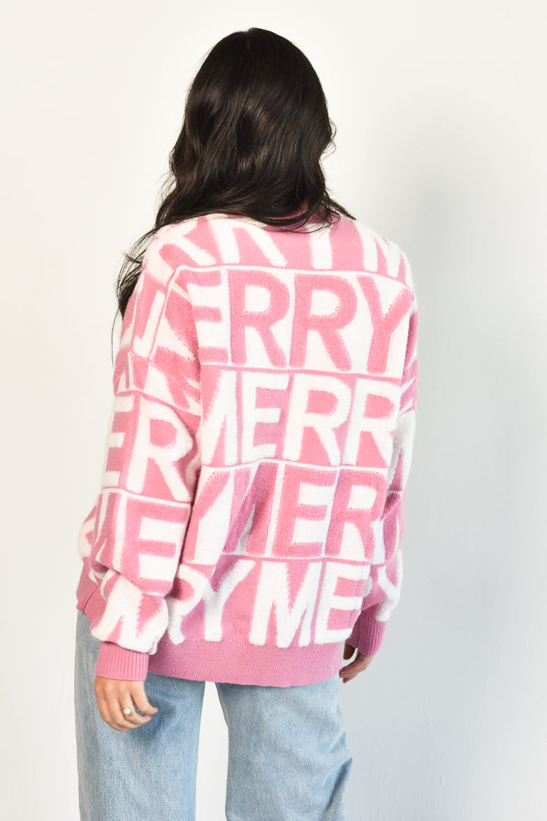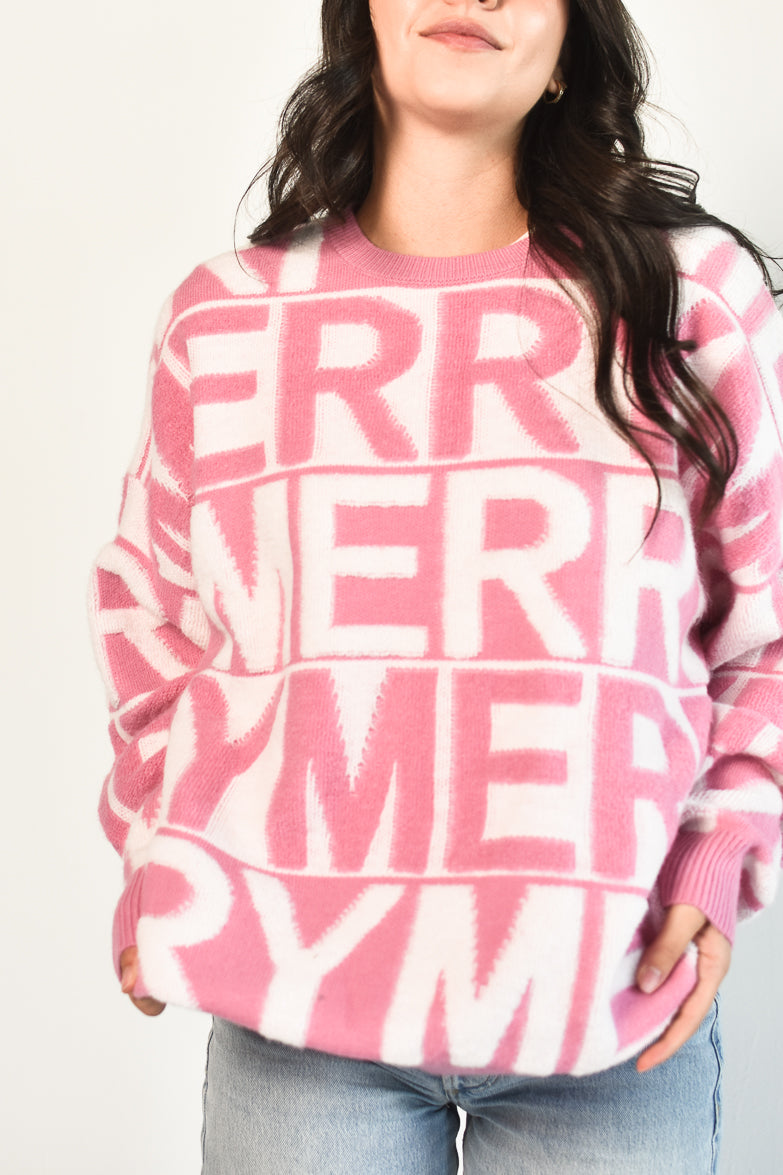 Grab the Pink Merry Pullover Sweater now, perfect for holiday events and everyday festive looks while supplies last. Add a pop of pink and a clear seasonal message to your wardrobe this season.