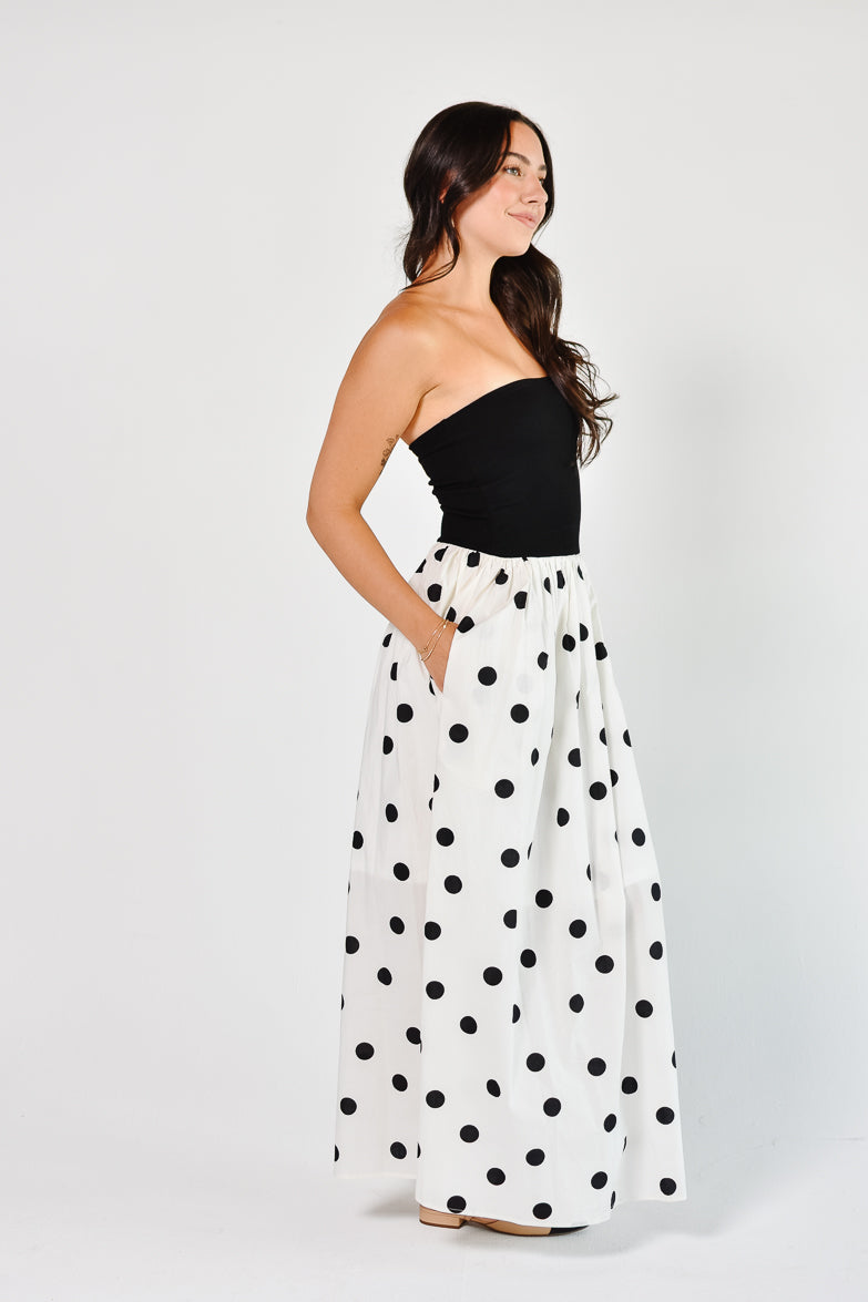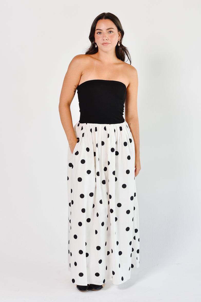 Channel your inner Roman holiday with the Sofia Polka Dot Maxi Dress!  This classic fit and flare dress pairs a strapless and stretchy black tube top that flows into a cream and black polka dot maxi skirt.  This is the most comfortable, easy-fitting, chic dress for vacation or brunch your gals.  Pullover style.  Pockets.