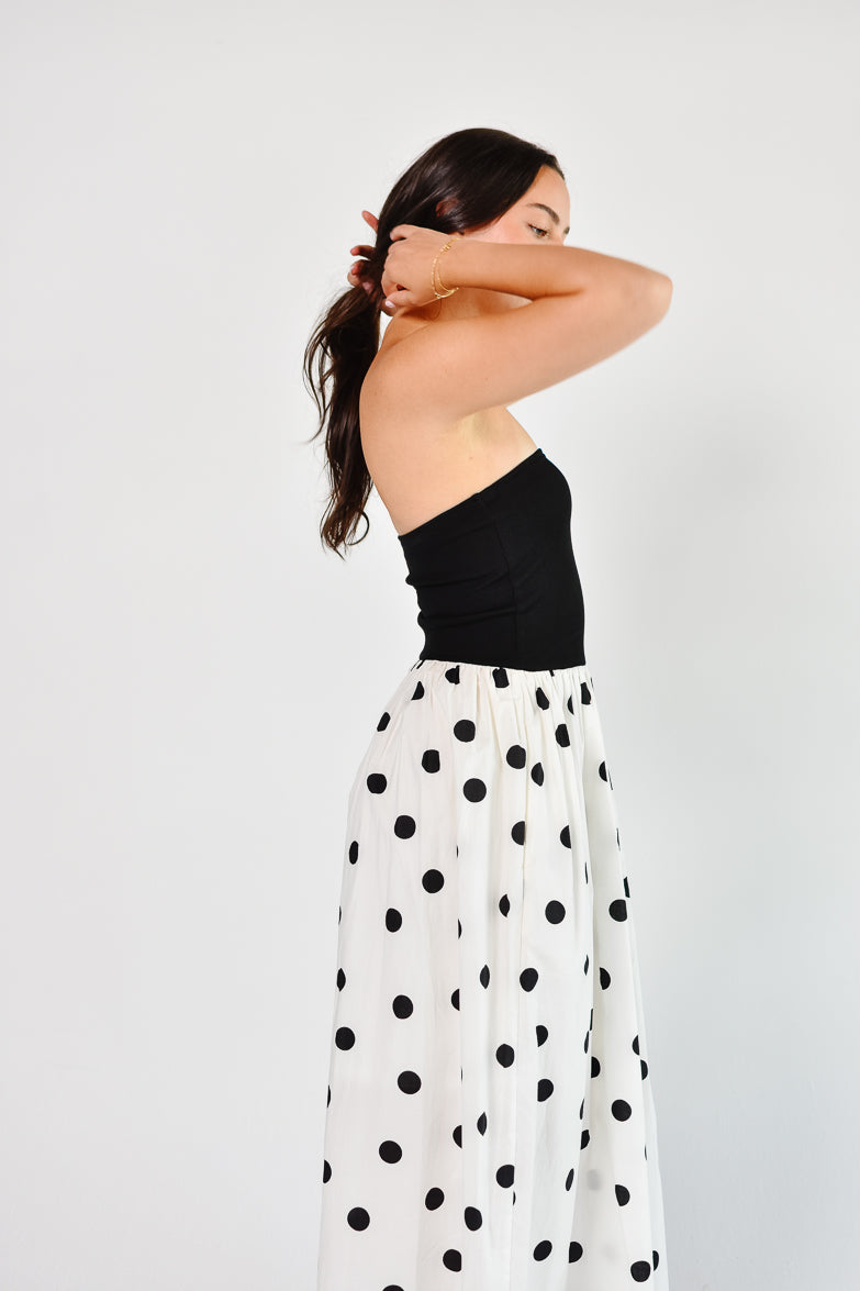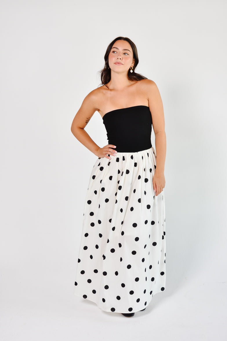 La Dolce Dot Strapless White and Black Polka Dot Maxi Dress