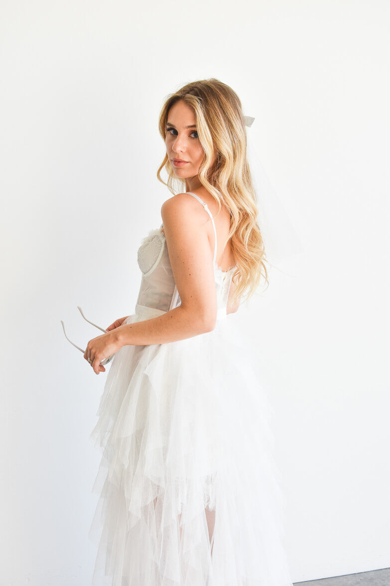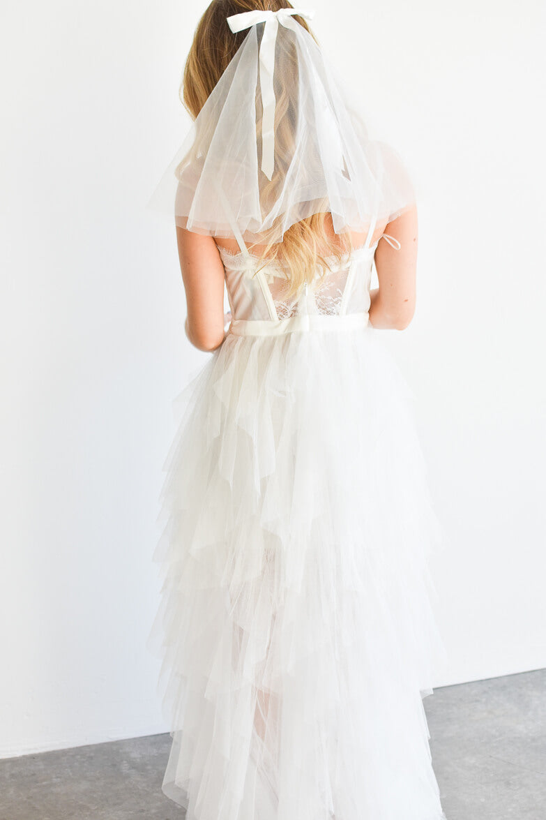 A budget friendly bride dress for the wedding after-party or bachelorette party - meet Elysée! This fashion-forward bridal style pairs classic lace with romantic tulle ruffles, featuring a lace mini dress with a bustier style top and a dramatic tulle ruffle high low maxi skirt. Enjoy removable straps for strapless styling as well. Hidden zipper back.
