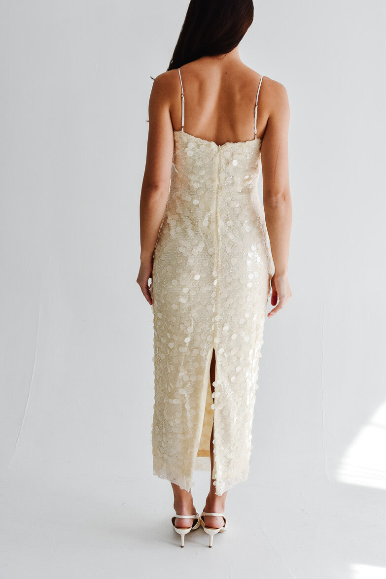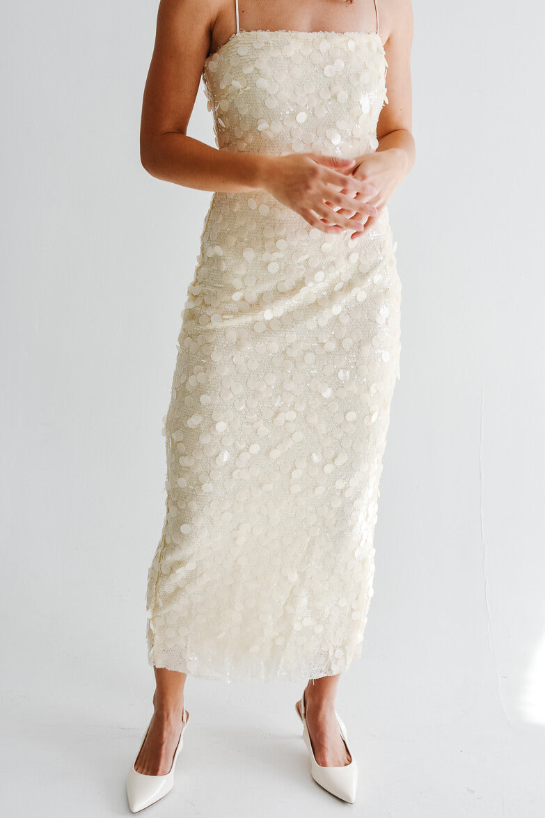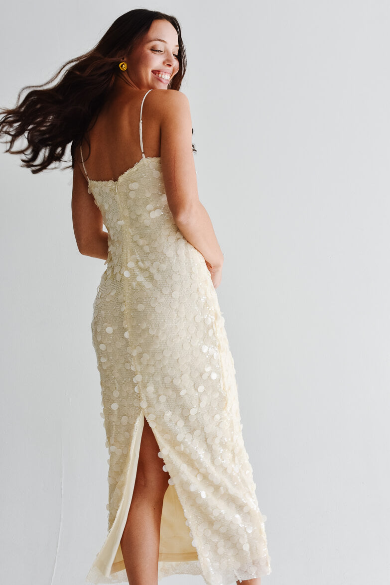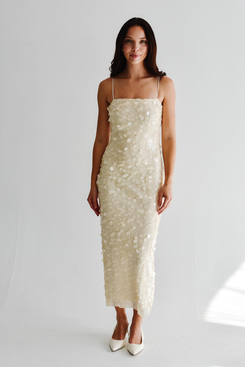 GARMENT DETAILS:  Dramatic cream sequin sheath midi dress.  Features a column silhouette and adjustable spaghetti straps with a hidden zipper back.  Lined.