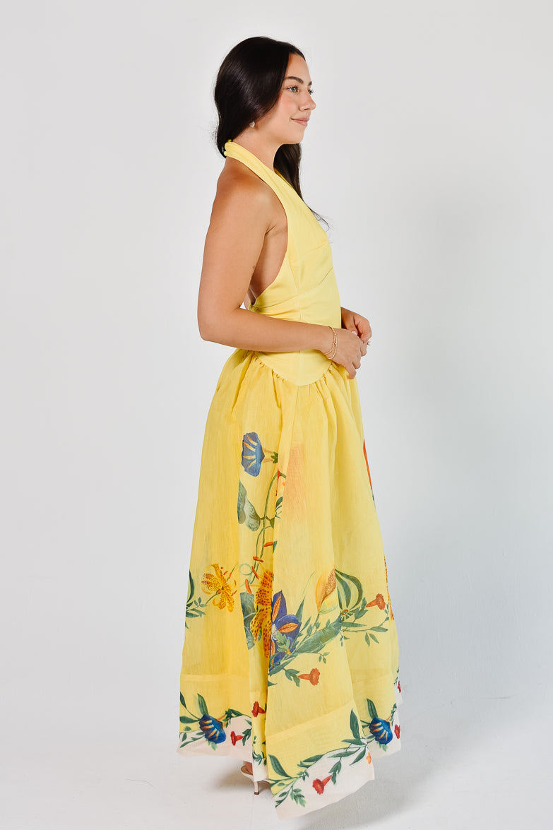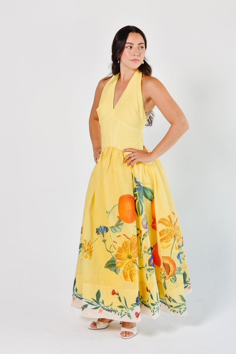 yellow botanical print maxi dress / halter neckline / zipper back / easy a-line skirt/ lined
