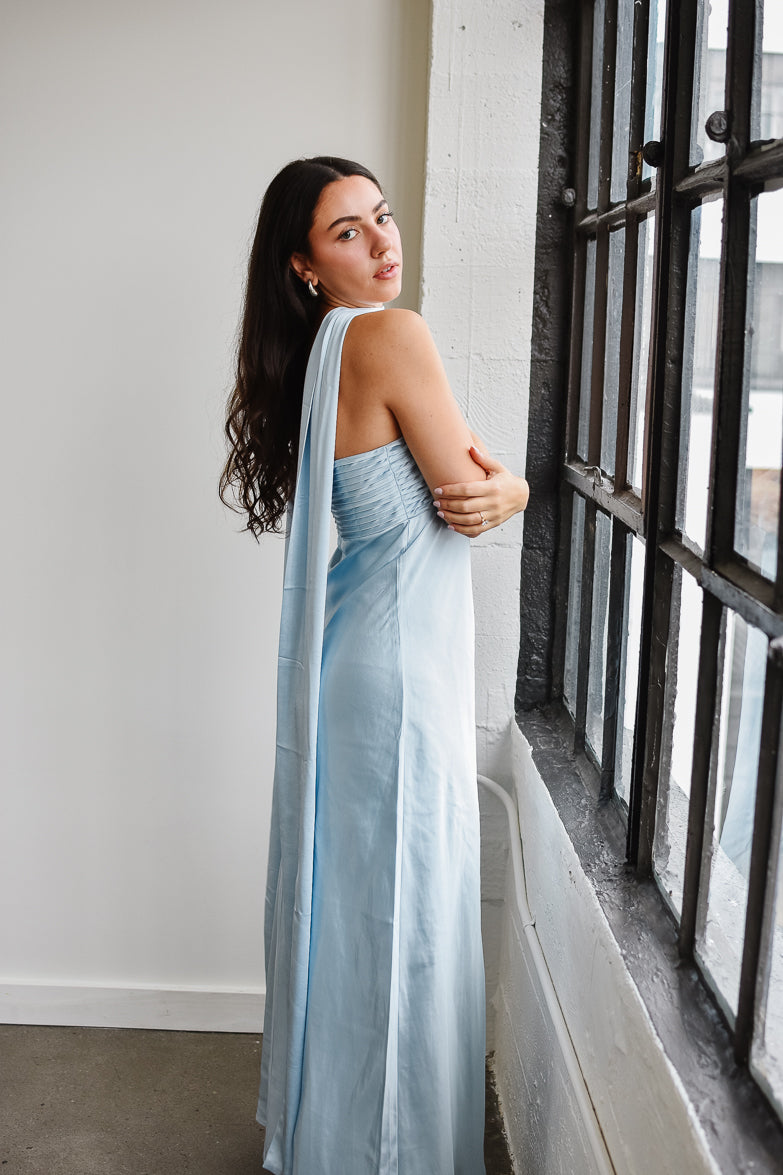 With feminine pleat detailing and a scarf that drapes over the shoulder, our Elsa Maxi Dress the perfect modern look for your next wedding guest appearance.