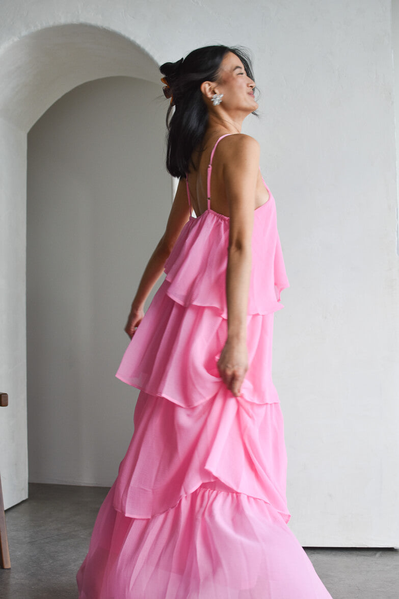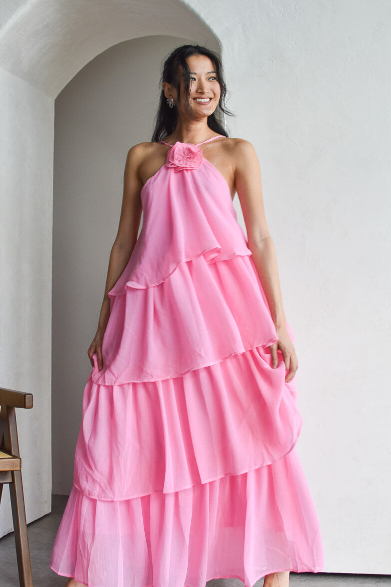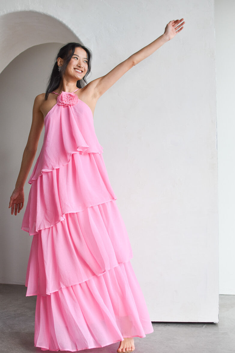 pink ruffle maxi dress / rosette detail / faux halter neckline / lined / adjustable shoulder straps