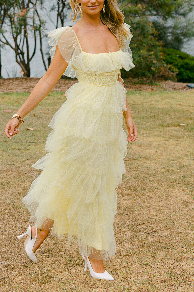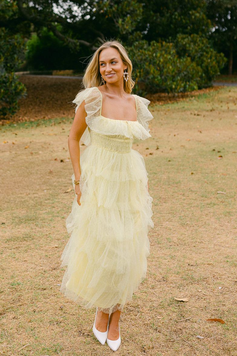 Delicate butter yellow Swiss Dot fabric makes the Valensole Maxi Dress a summer classic!